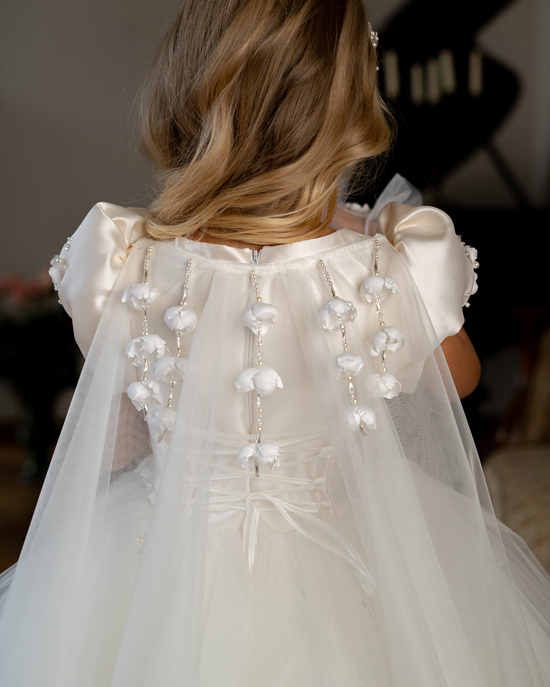 Soft puff sleeves add a touch of vintage charm, while the full tulle skirt creates a dreamy, princess-like silhouette. The gown is finished with a breathtaking sheer cape back, detailed with cascading floral pearls that flow gracefully from the shoulders, creating an unforgettable look from behind.