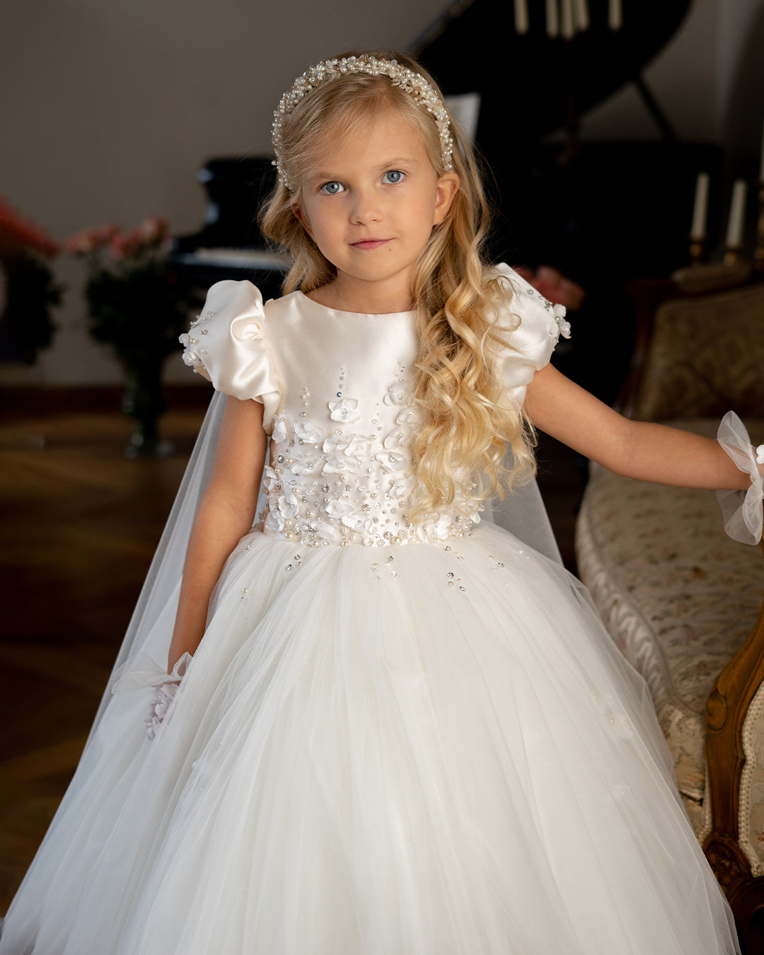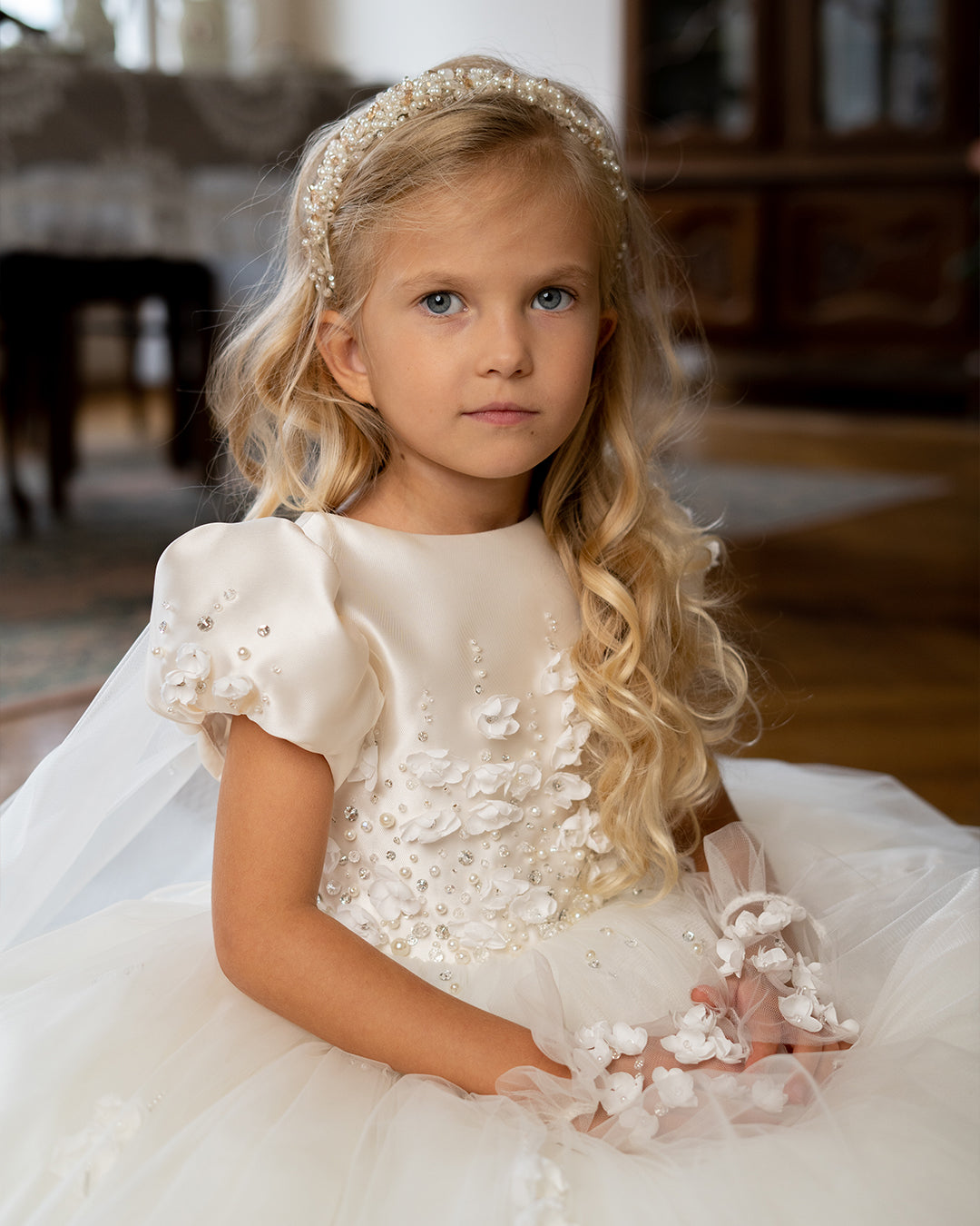 Perfect for flower girls, weddings, christenings, first communions and formal celebrations, the Elysia Pearl Gown is designed to feel light, comfortable and truly magical. A dress made to be treasured, photographed and remembered for years to come.