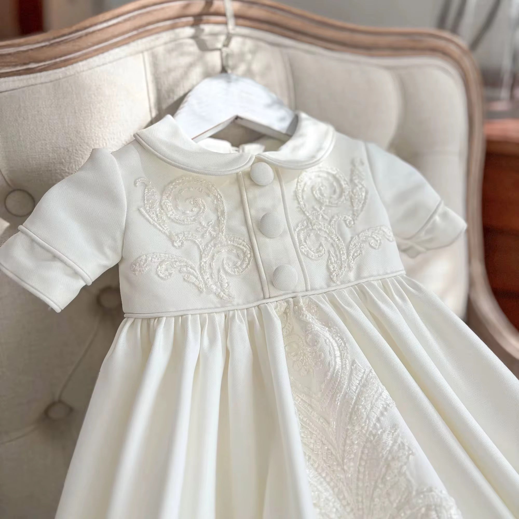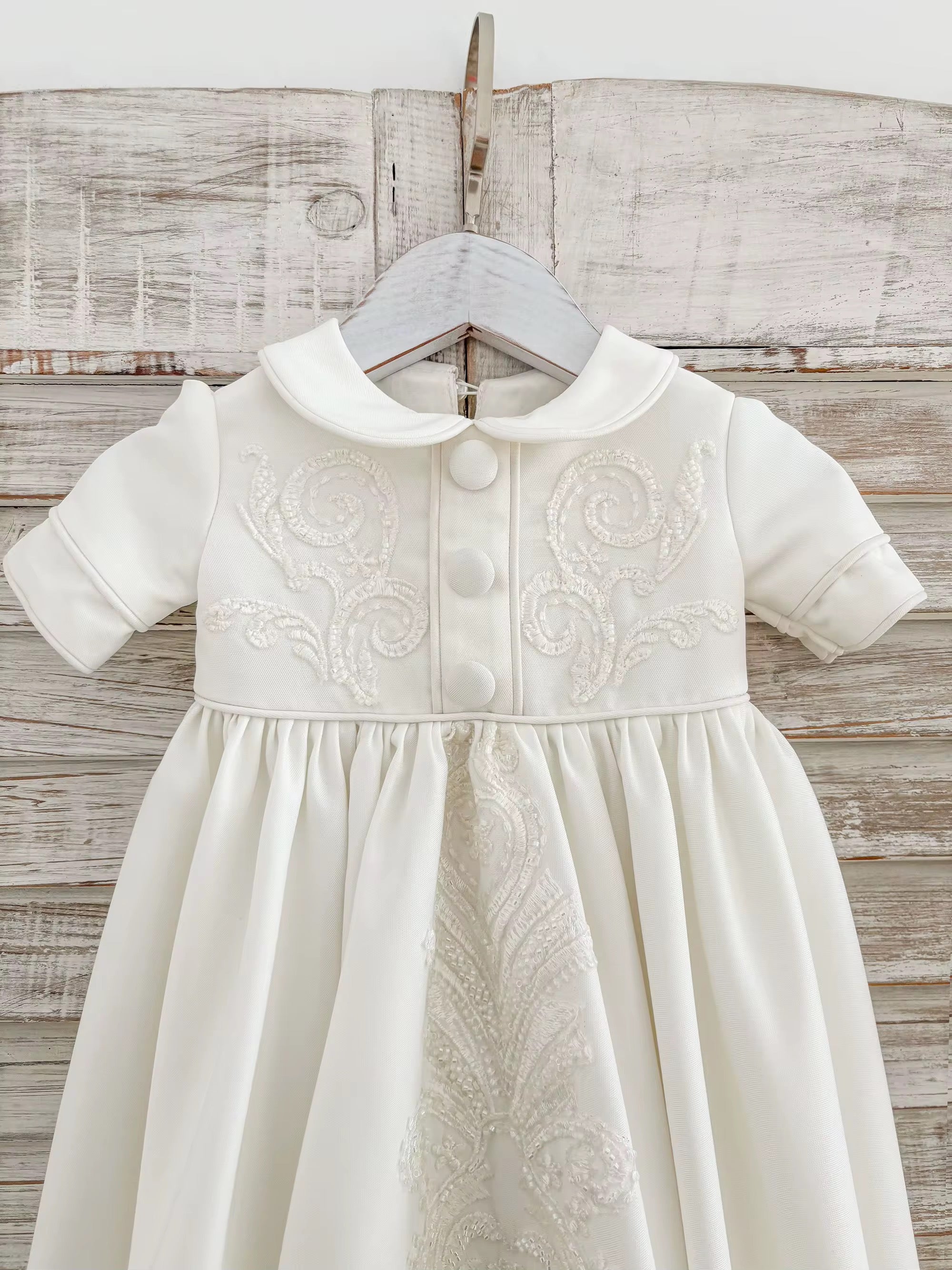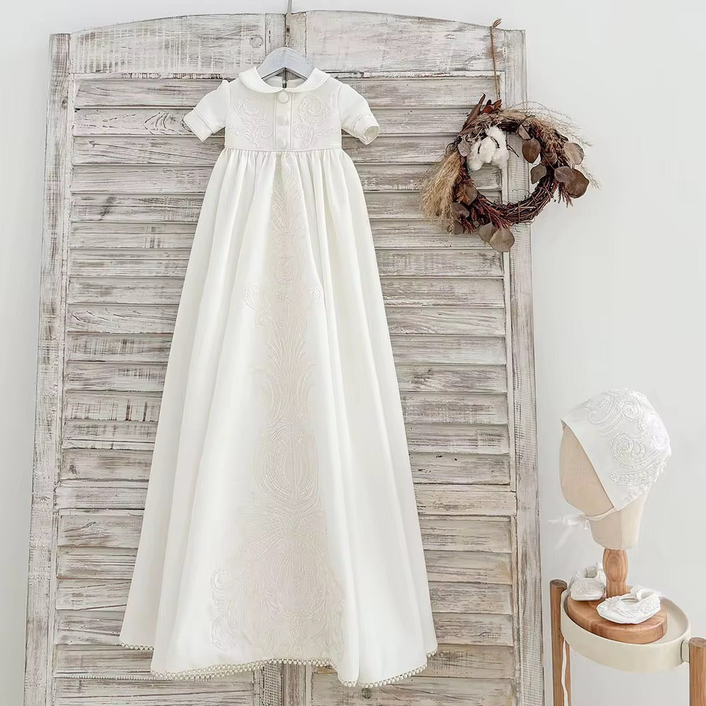 A delicate Peter Pan collar frames the neckline, enhancing the gown’s traditional charm, while covered buttons run down the front for a refined, polished finish. The skirt falls gracefully with gentle volume, featuring a statement embroidered panel that draws the eye and elevates the entire piece.