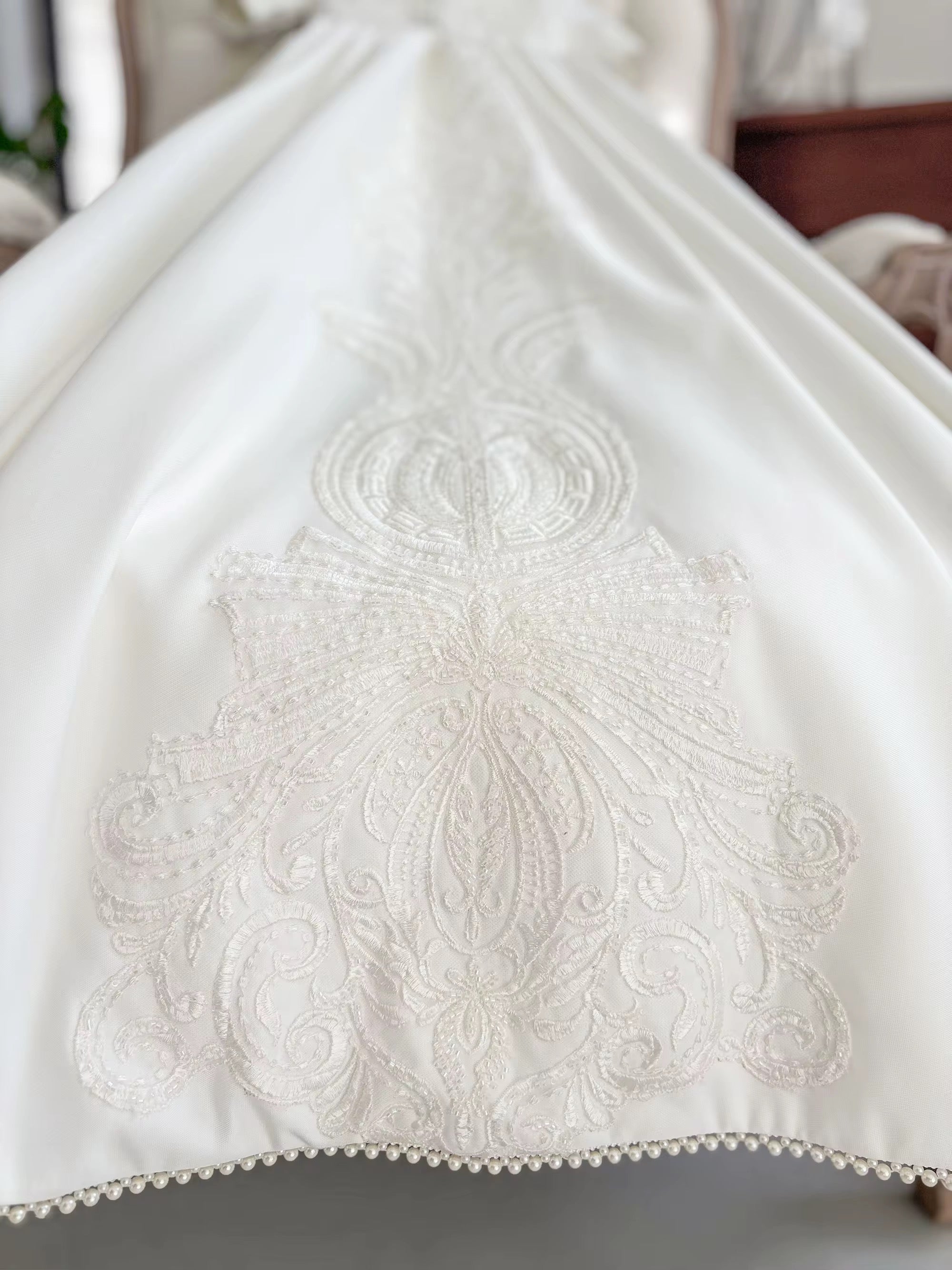 Crafted from luxurious structured Mikado fabric, this gown features a beautifully sculpted silhouette that drapes effortlessly into a full-length, flowing design. The bodice is adorned with intricate, hand-finished embroidery — inspired by classic European motifs — adding depth, texture, and a quiet sense of opulence.