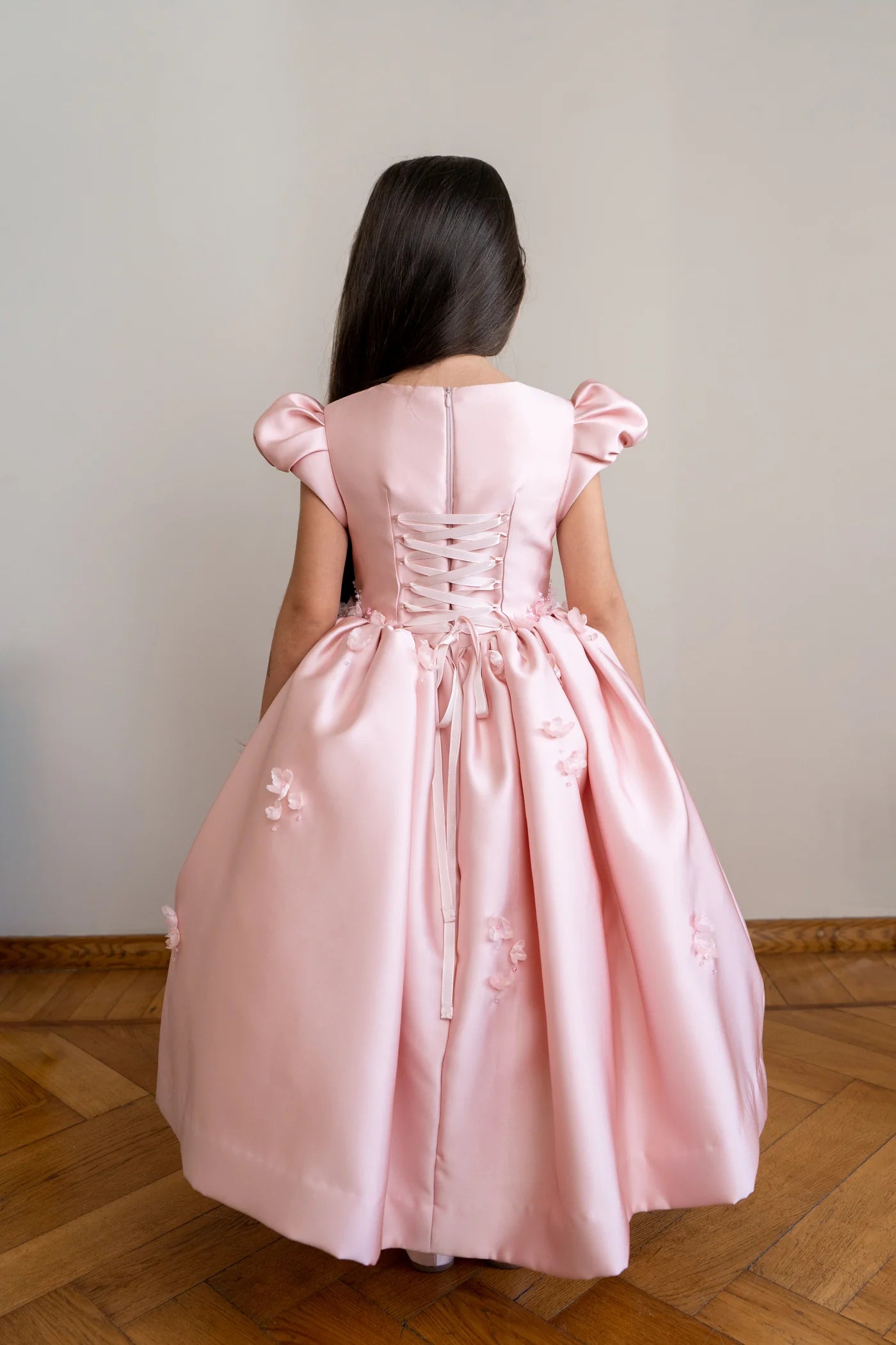 The bodice is intricately hand-embellished with 3D floral appliqués, shimmering beads, and subtle pearl detailing, creating a romantic texture that catches the light beautifully. A lace-up corset back allows for an adjustable fit while adding a couture finish rarely found in children’s occasion wear.