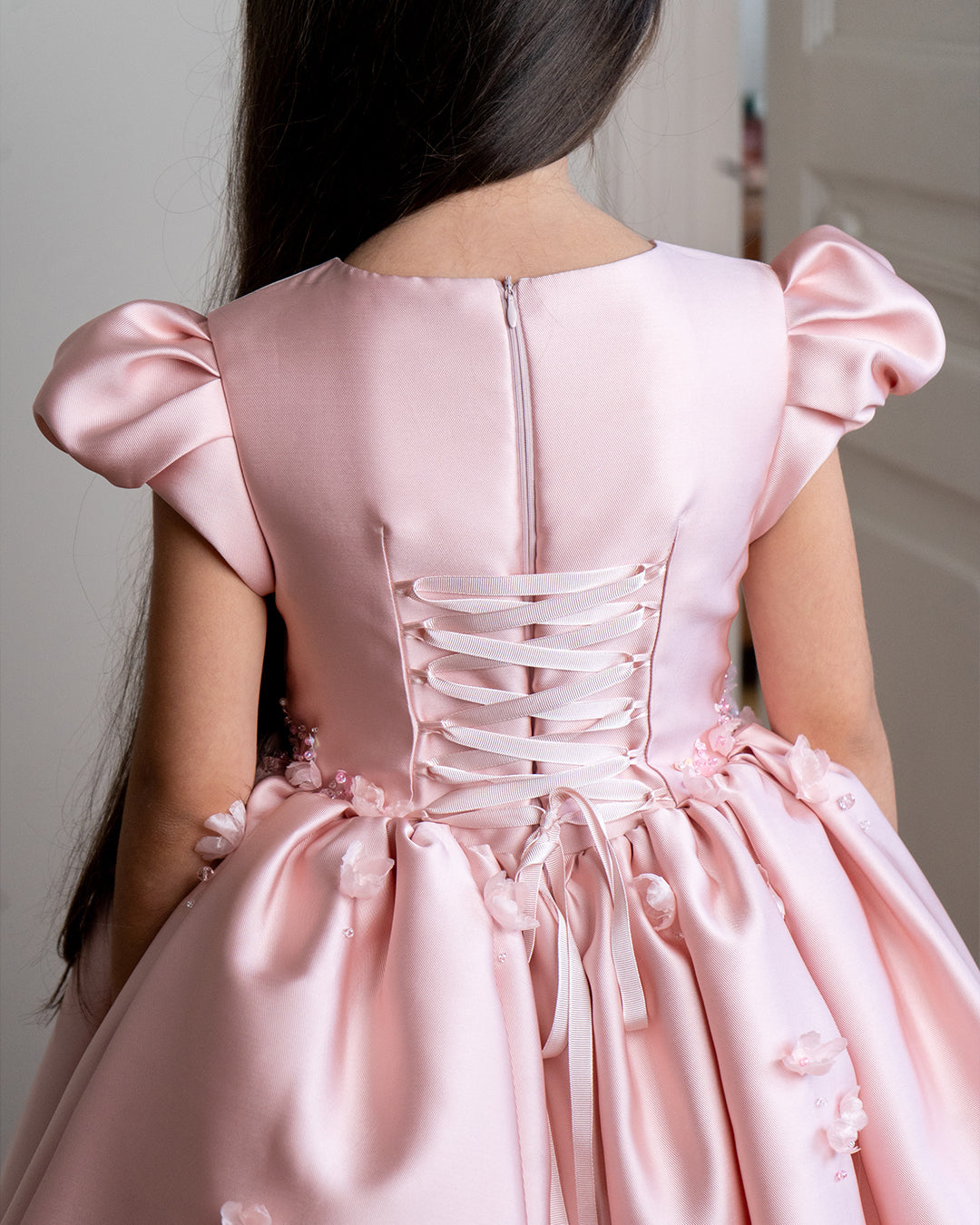 The Fleur de Perle Dress is a handcrafted masterpiece designed for unforgettable moments. Made in Europe with exceptional attention to detail, this luxury flower girl dress features soft blush satin, delicate puff sleeves and a full structured skirt for a truly regal silhouette.