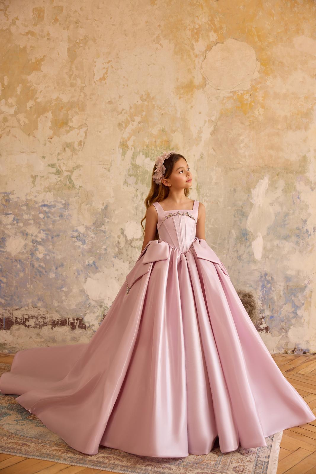 The full, flowing skirt is finished with dramatic oversized bow detailing at the back, creating a show-stopping look from every angle. Crafted from luxurious satin with a soft sheen, the Rosalie Belle Gown moves effortlessly, making it perfect for twirls, photographs and magical moments.