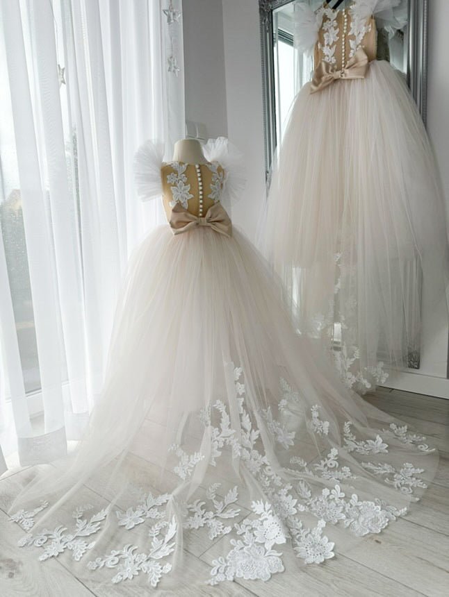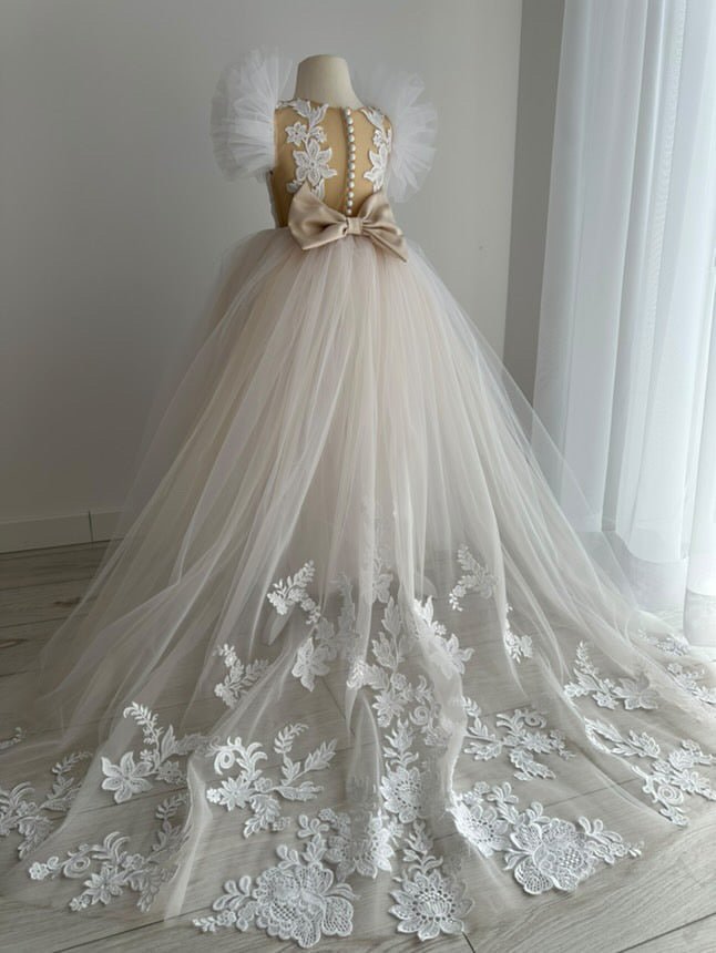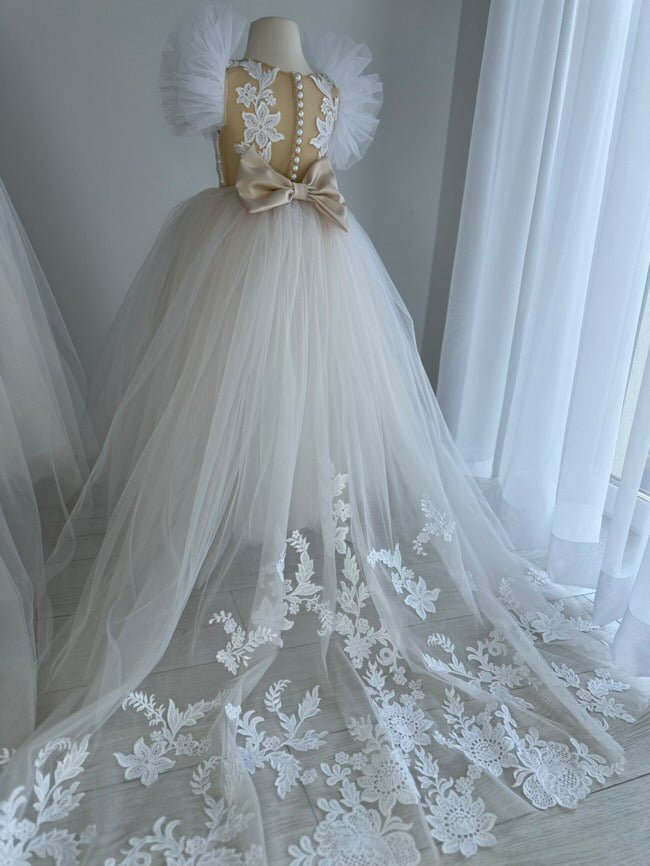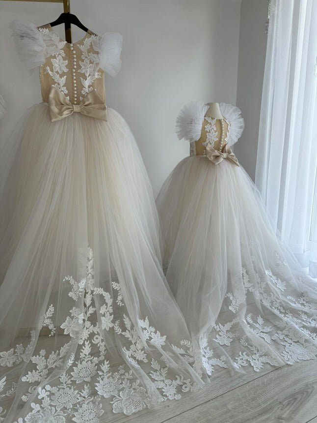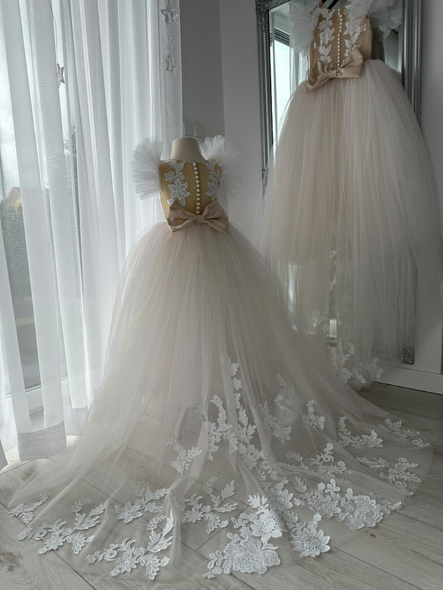 Crafted for little girls who love to sparkle, the Amira Luxe Embroidered Gown is the ultimate luxury flower girl dress. Featuring soft champagne tulle with intricate floral embroidery, this gown flows into a dreamy long train for a true princess look.