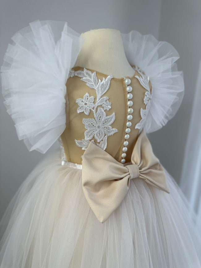 The bodice includes delicate pearl buttons, floral applique detailing and a satin bow at the waist. Puffy tulle sleeves add sweetness and volume while keeping the dress lightweight and comfortable. Fully lined in soft cotton, this gown is designed for full-day wear.