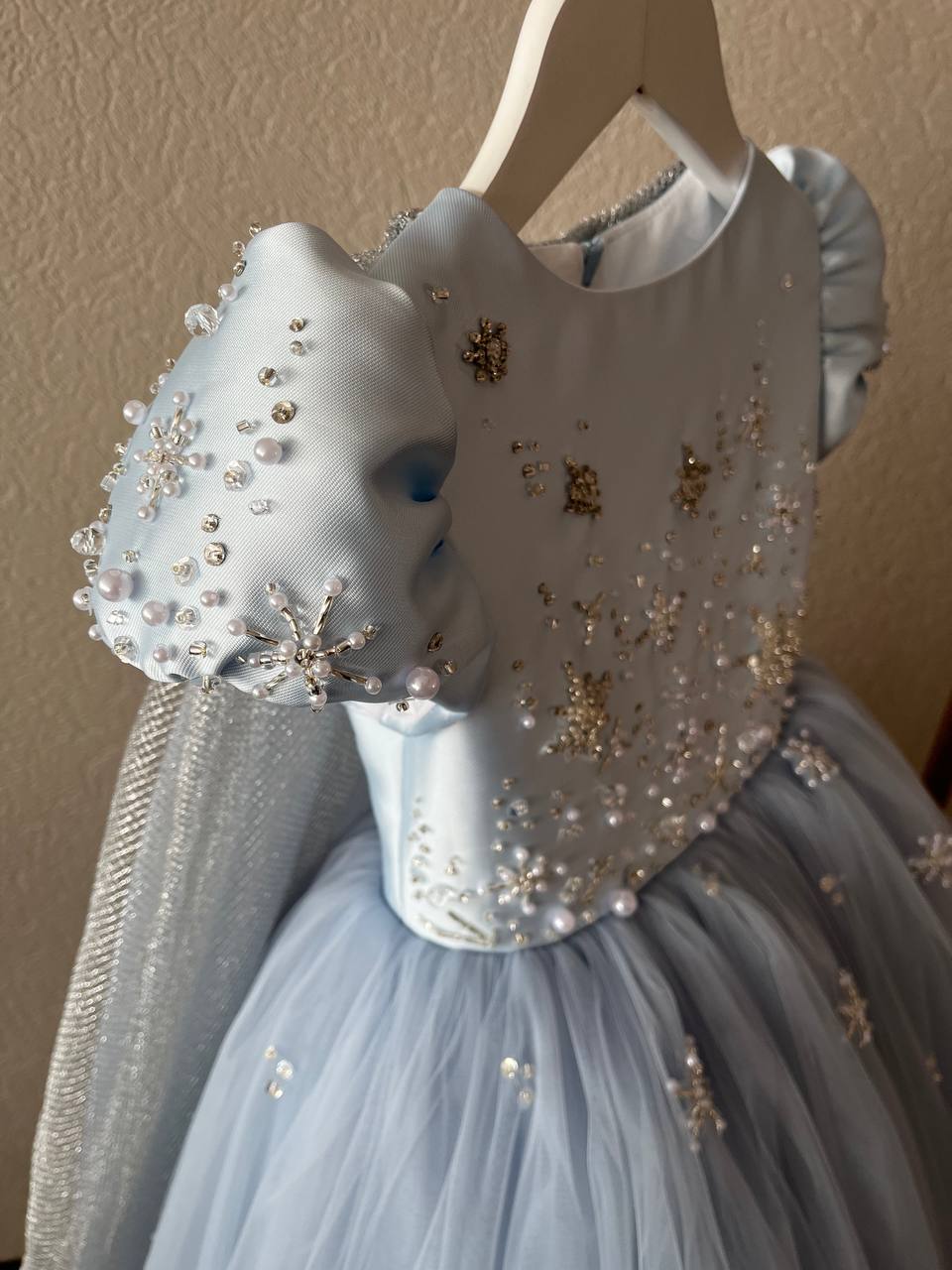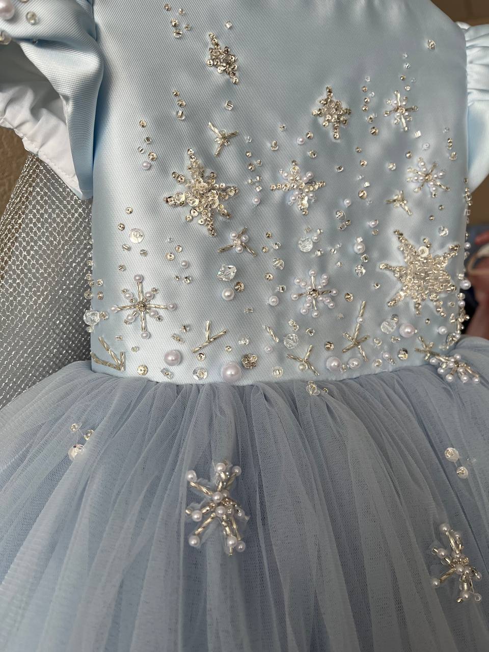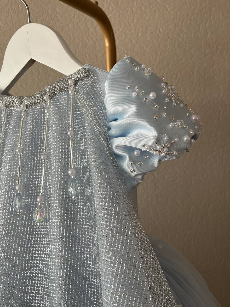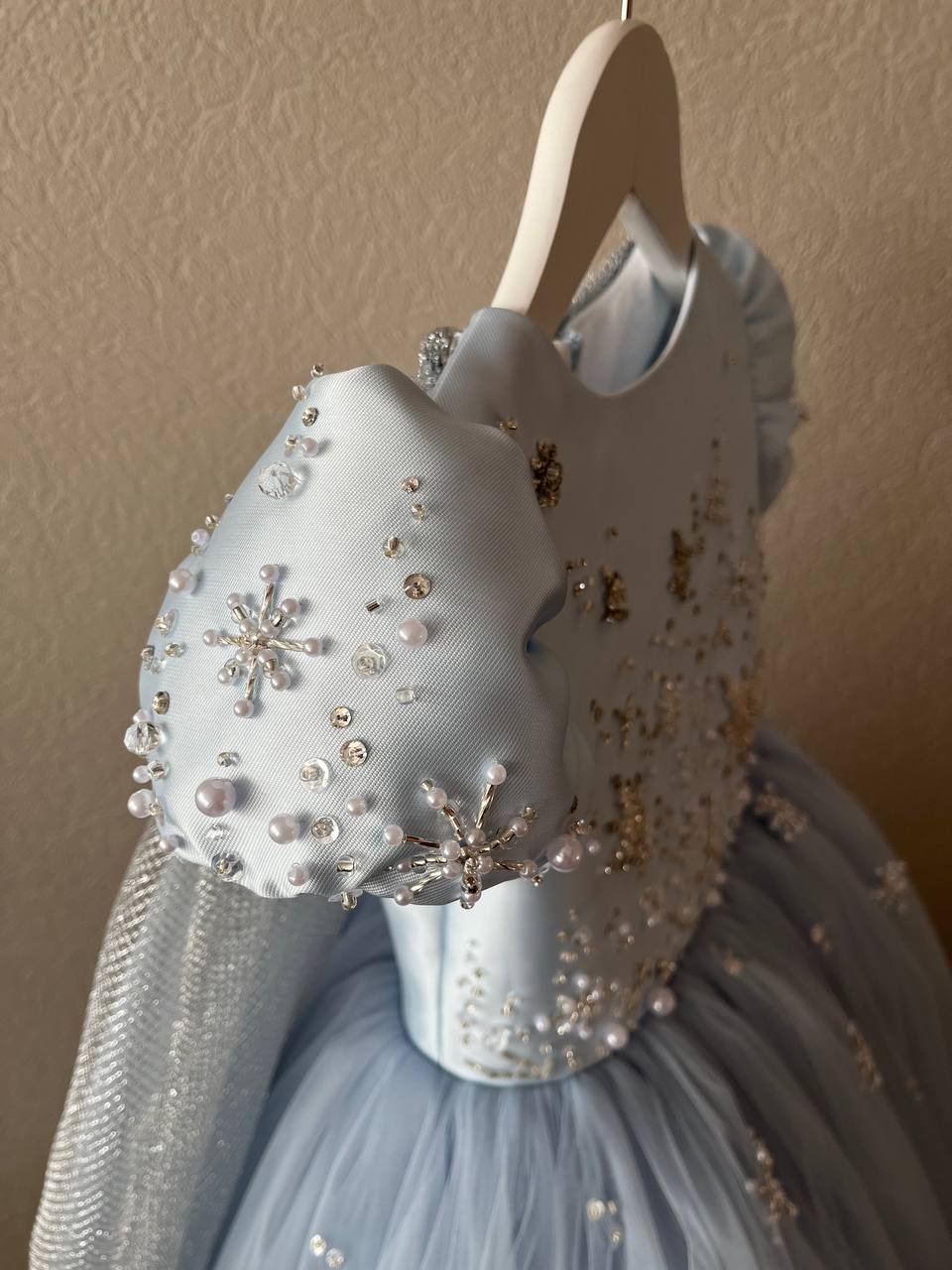 The soft puff sleeves are richly detailed with pearls and crystal clusters, adding volume, elegance, and a regal silhouette. Flowing from the waist is a full layered tulle skirt in ethereal ice blue, delicately scattered with hand-applied snowflake appliqués that sparkle with every movement.