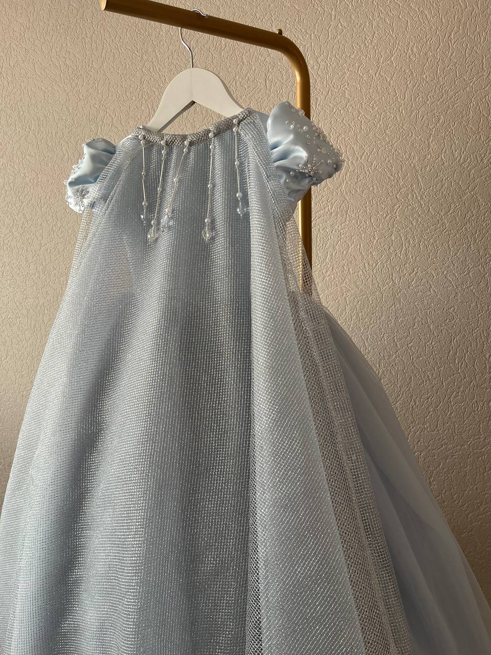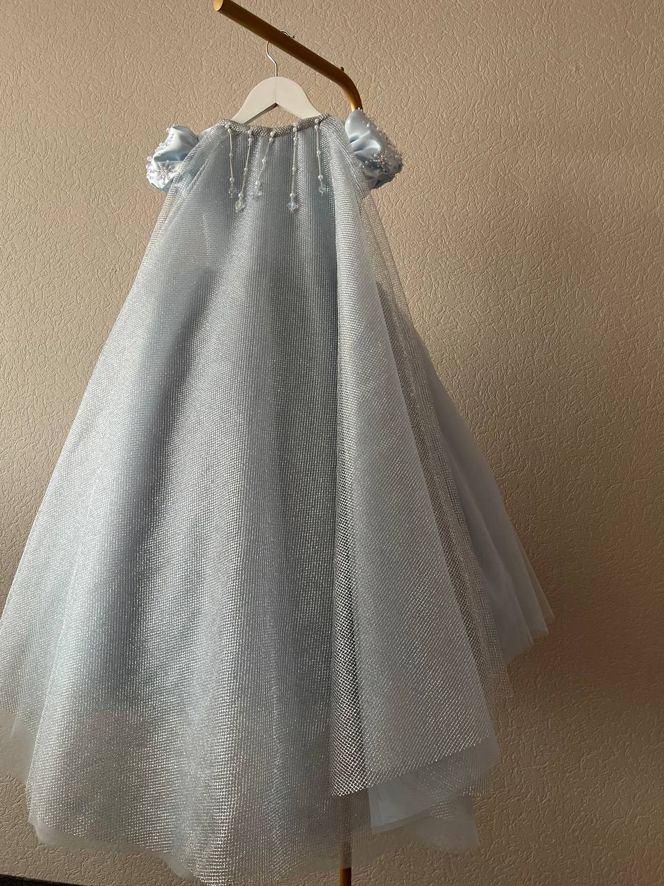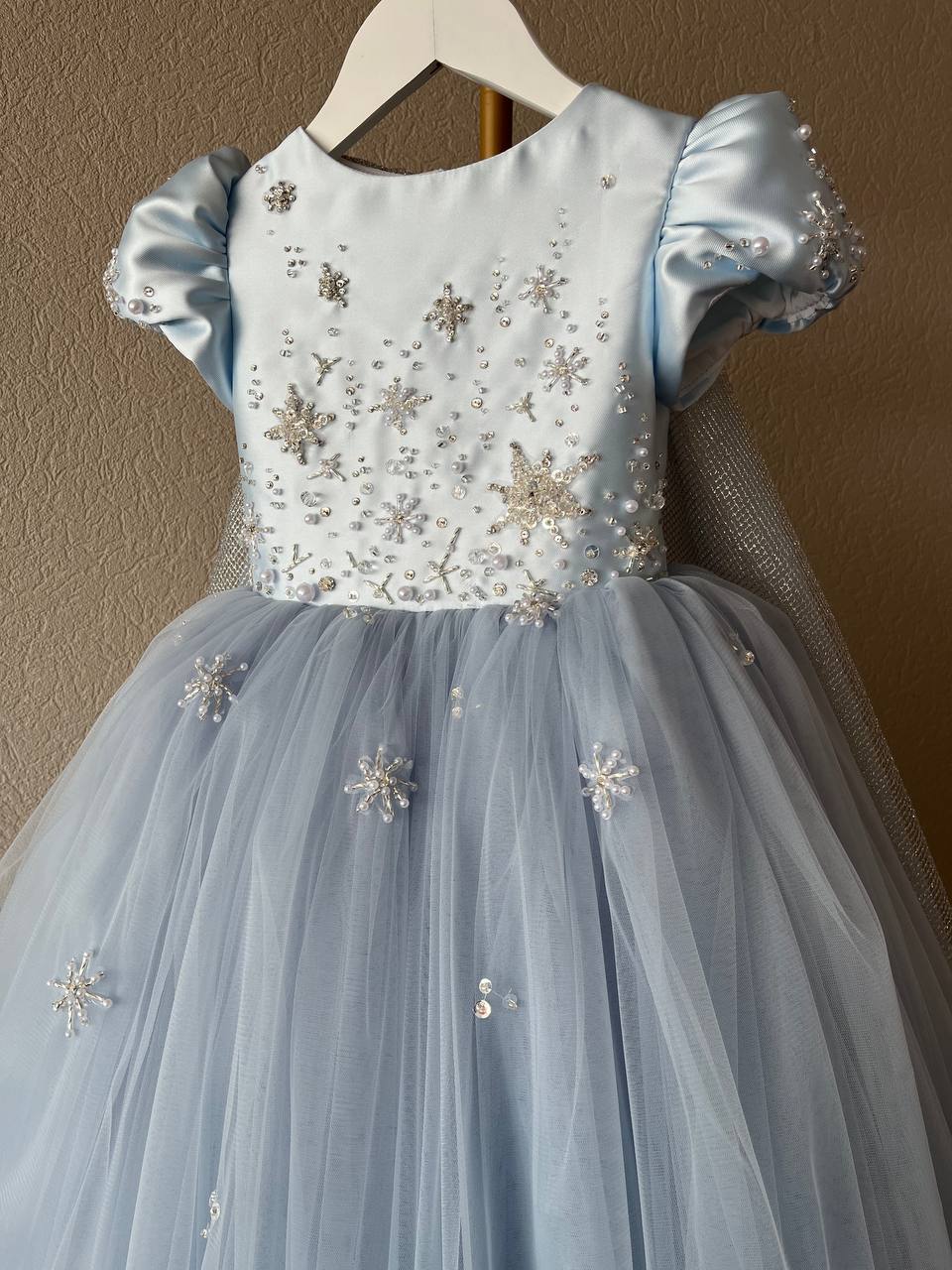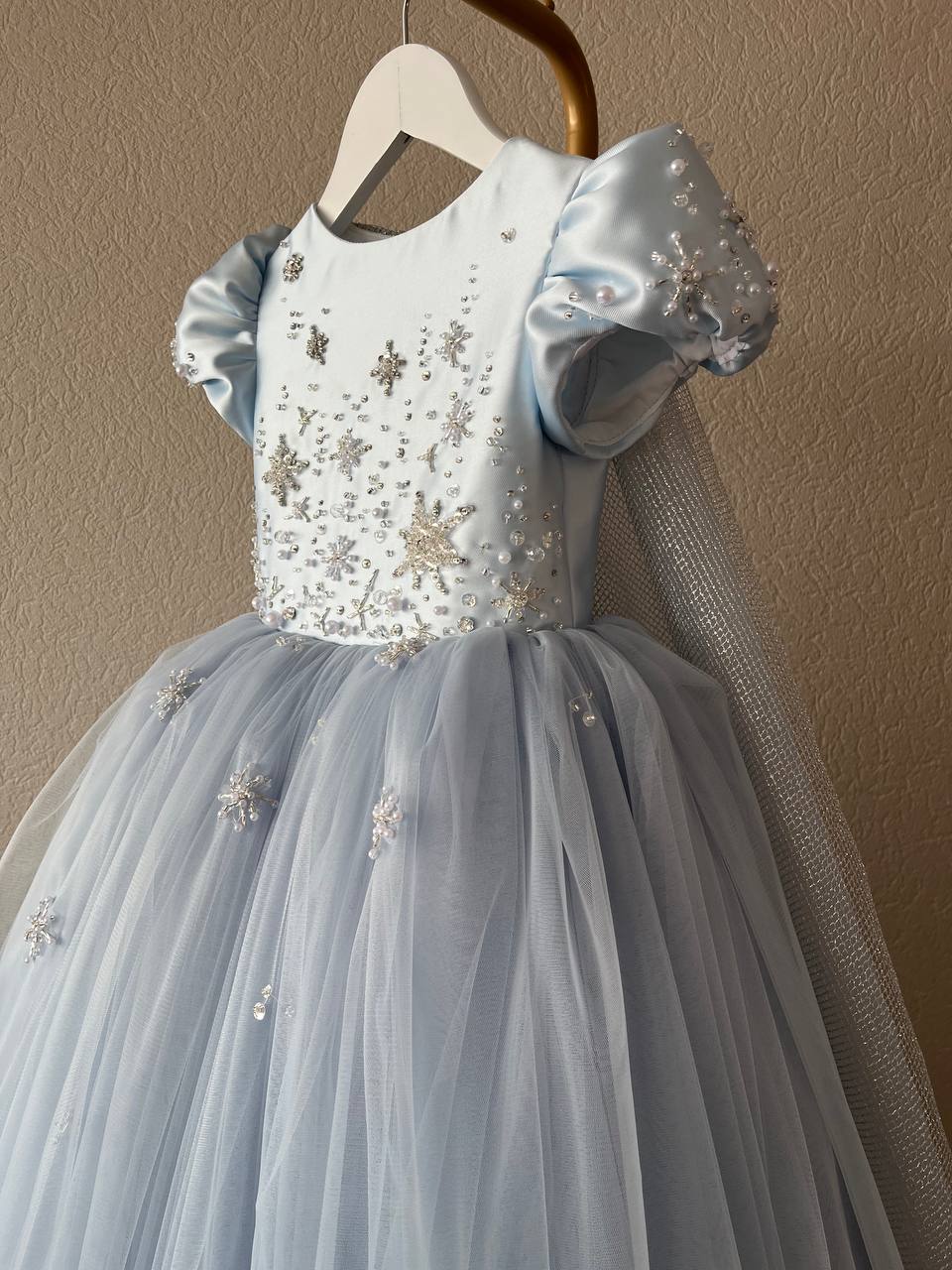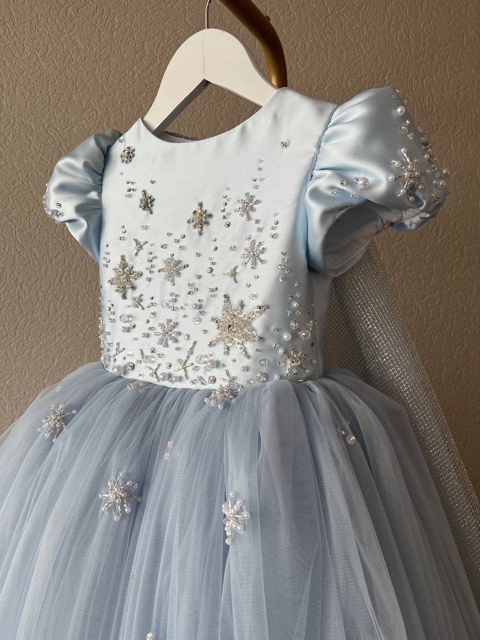 The soft puff sleeves are richly detailed with pearls and crystal clusters, adding volume, elegance, and a regal silhouette. Flowing from the waist is a full layered tulle skirt in ethereal ice blue, delicately scattered with hand-applied snowflake appliqués that sparkle with every movement.