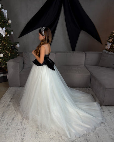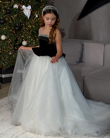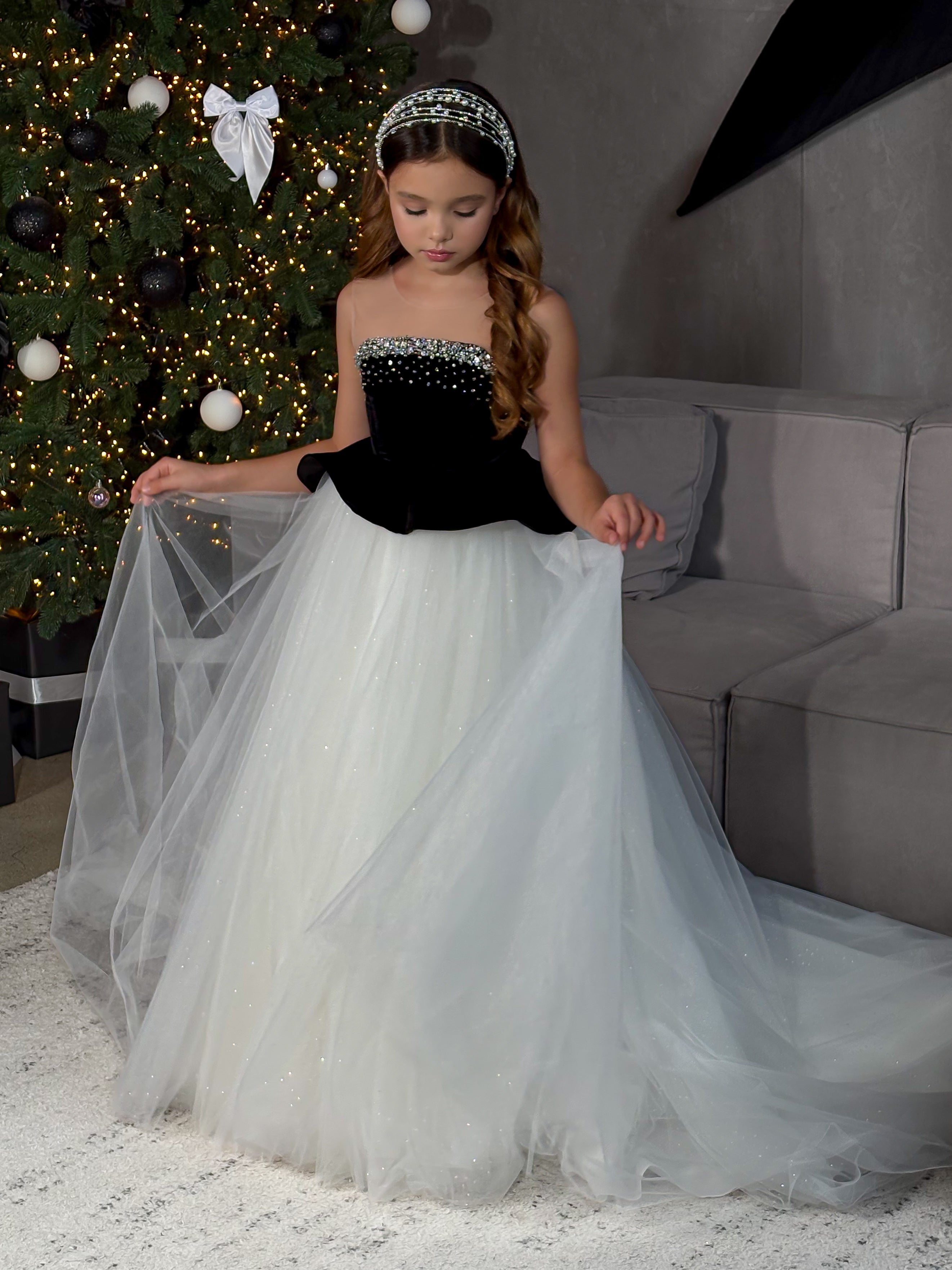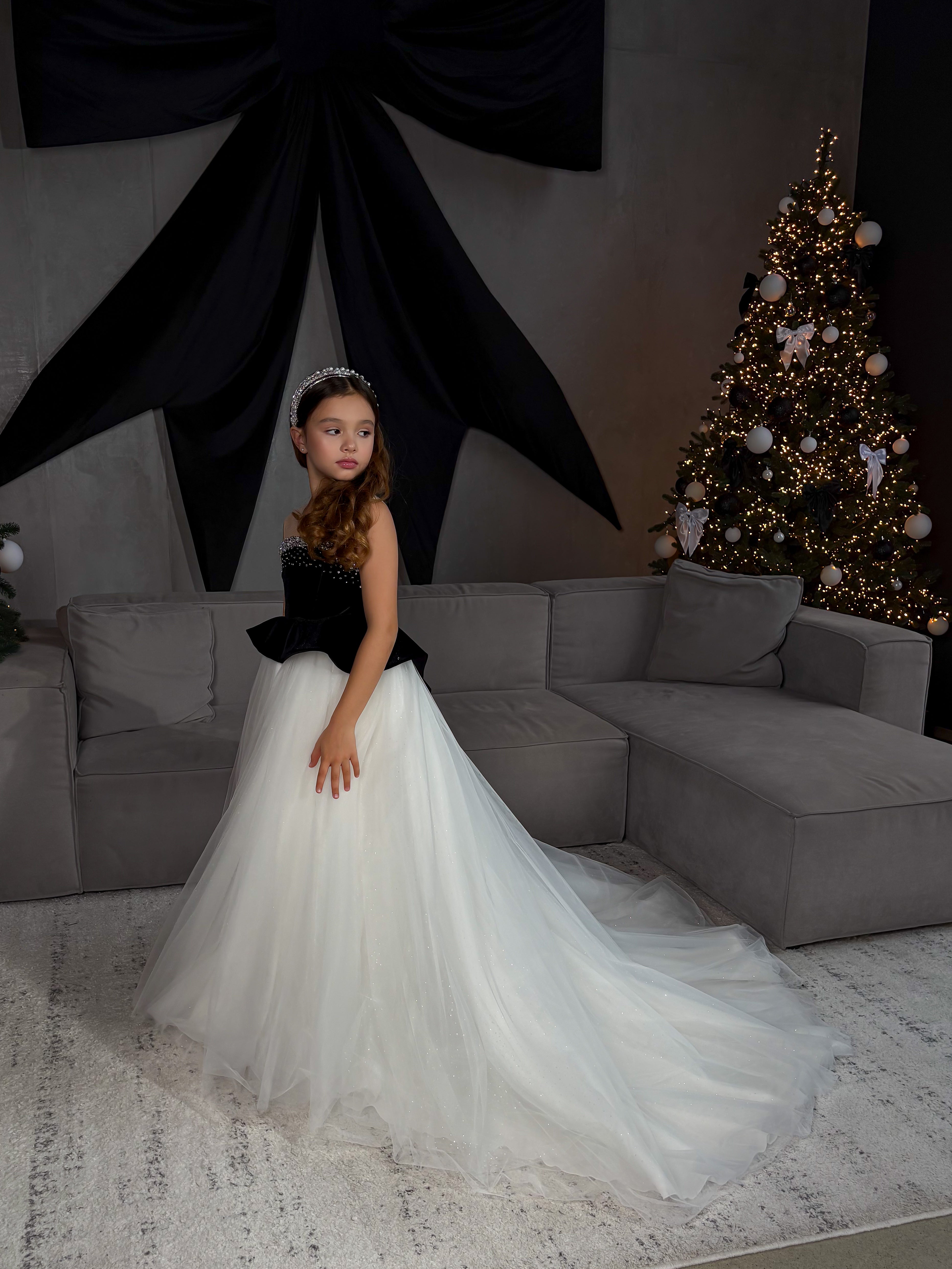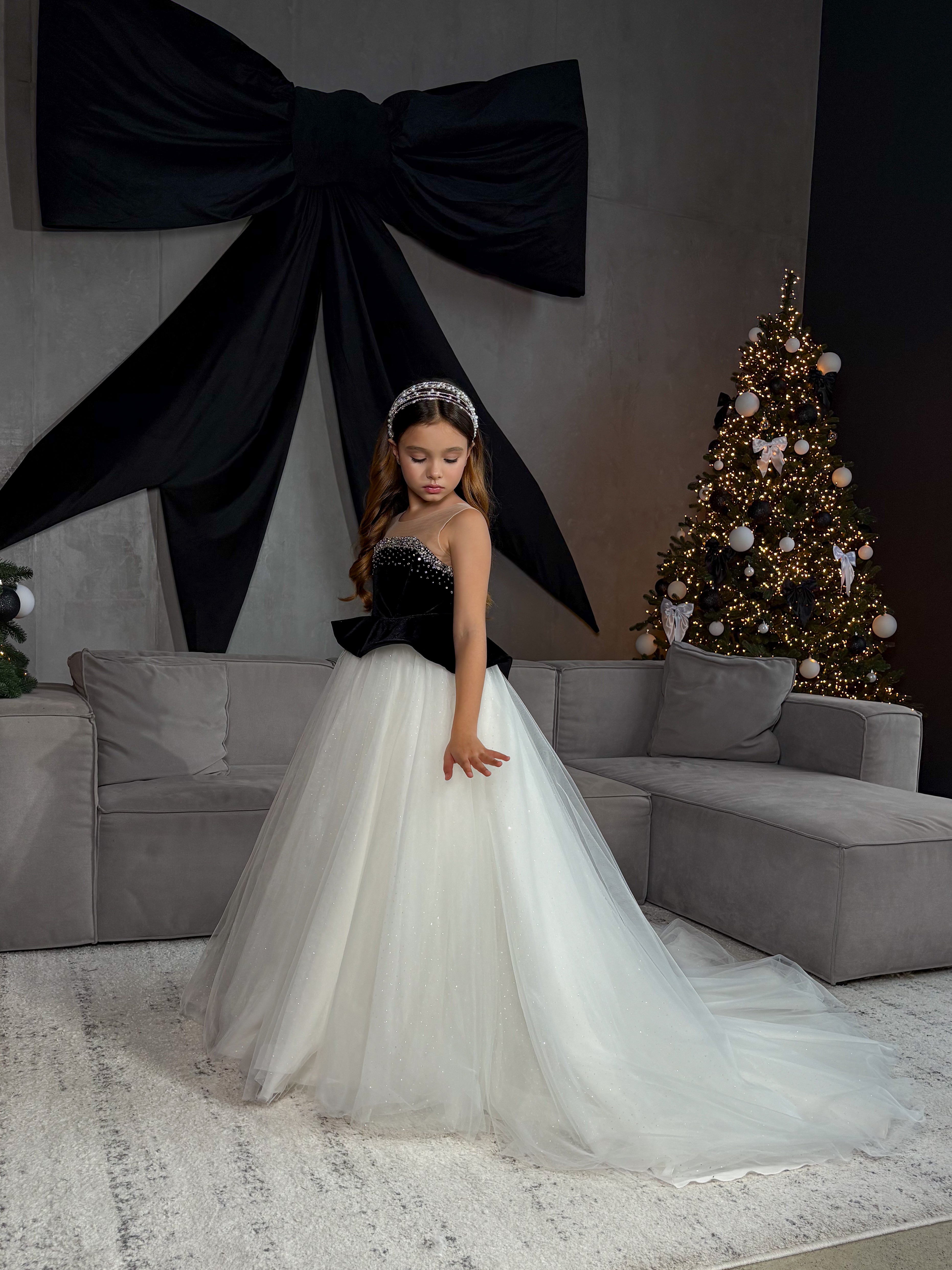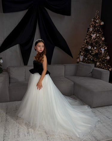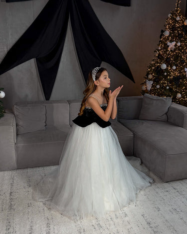 Falling from the waist is a snow white layered tulle skirt, lightly dusted with sparkle and flowing into a dreamy train. The contrast of black velvet and white airy tulle creates a timeless monochrome look perfect for Christmas events, holiday photoshoots, birthdays, pageants and luxury celebrations.