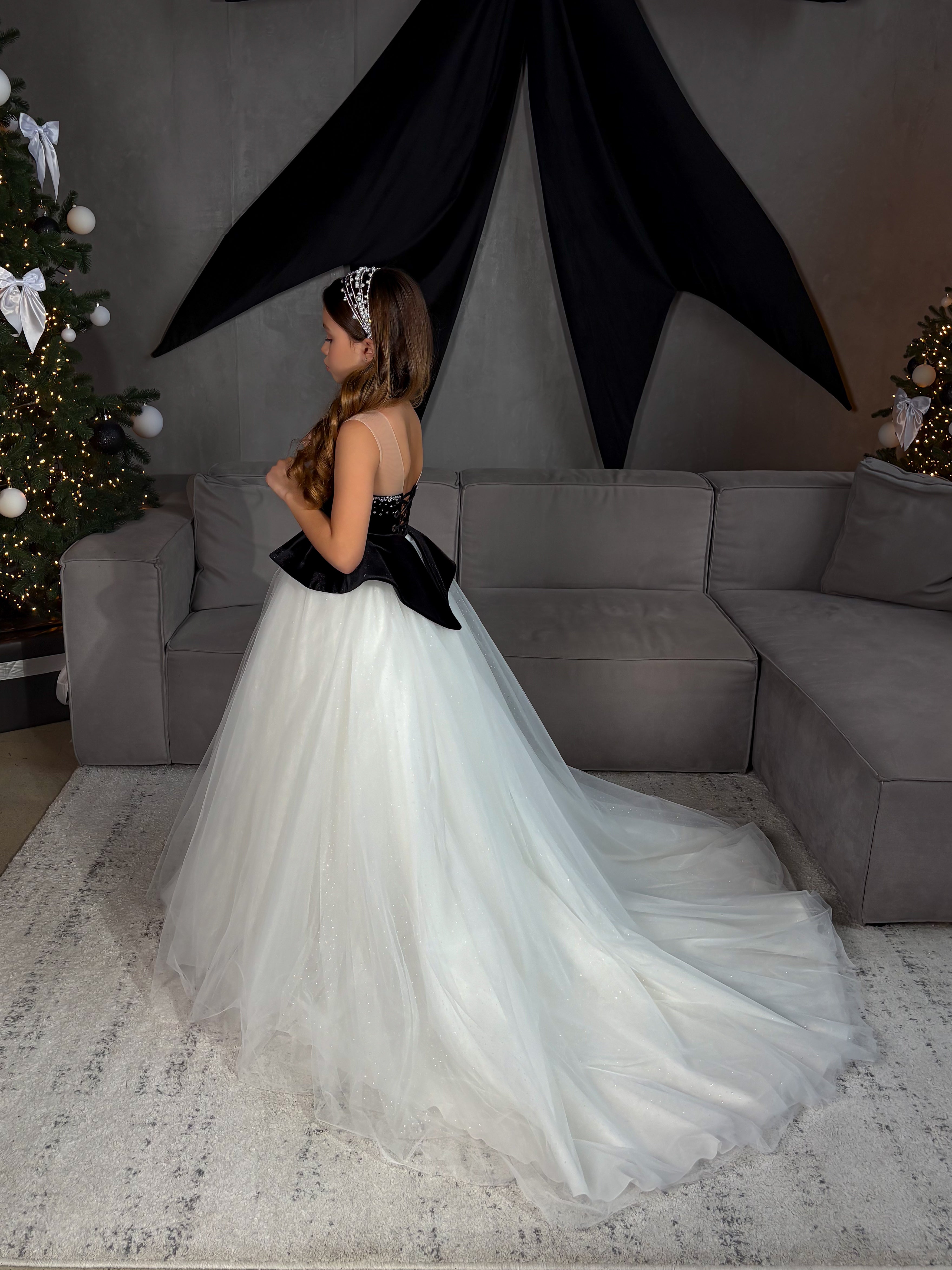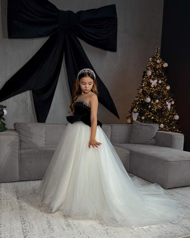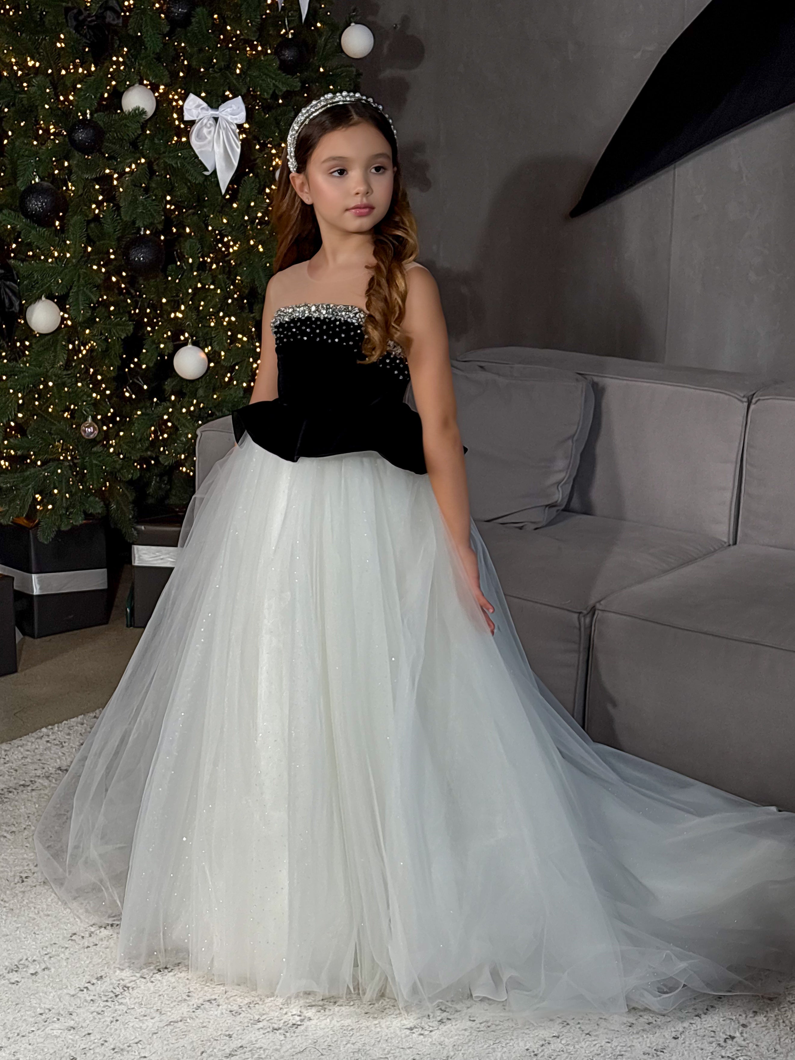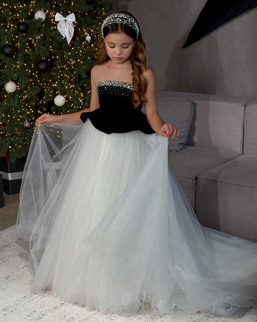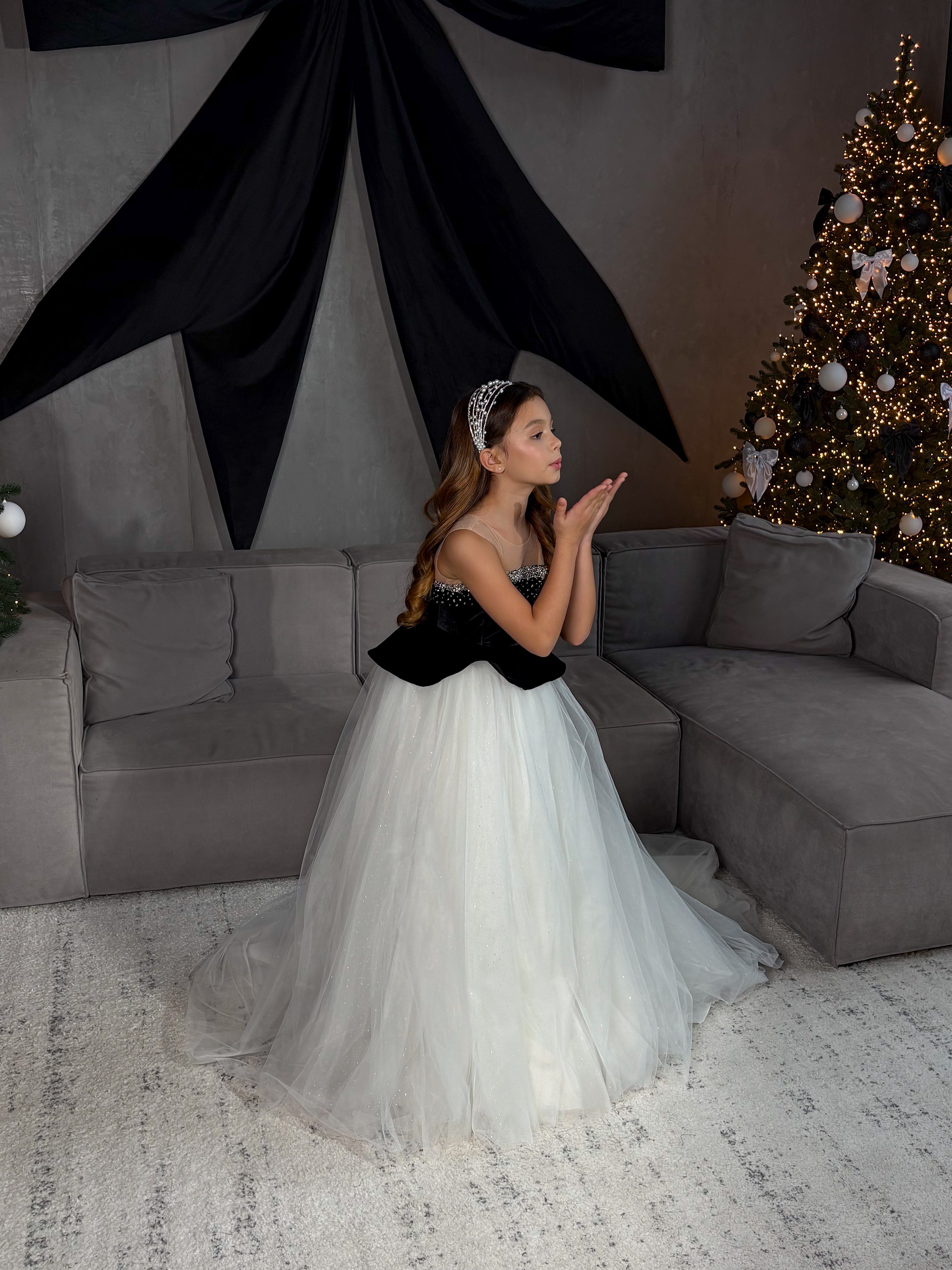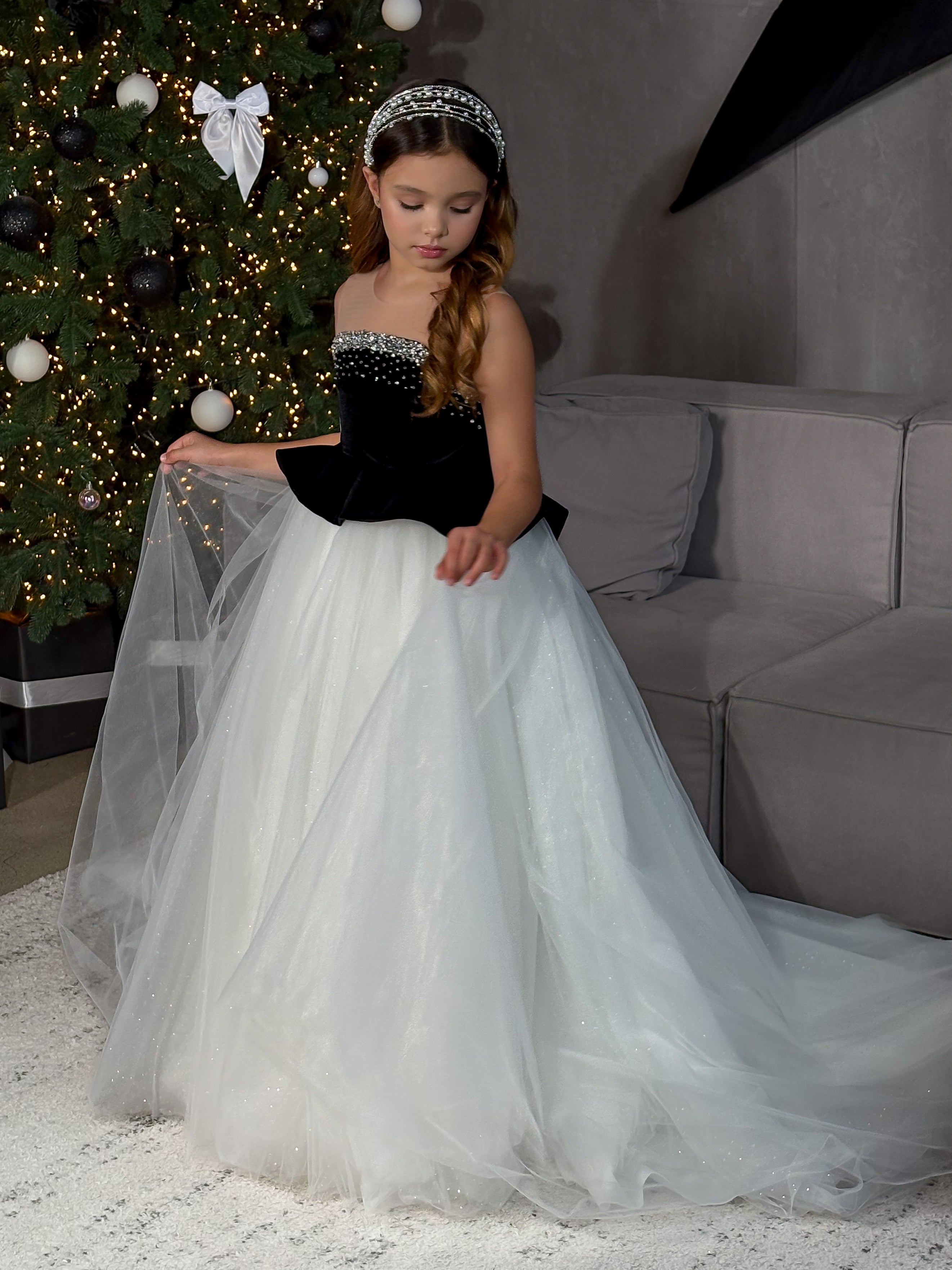 Falling from the waist is a snow white layered tulle skirt, lightly dusted with sparkle and flowing into a dreamy train. The contrast of black velvet and white airy tulle creates a timeless monochrome look perfect for Christmas events, holiday photoshoots, birthdays, pageants and luxury celebrations.