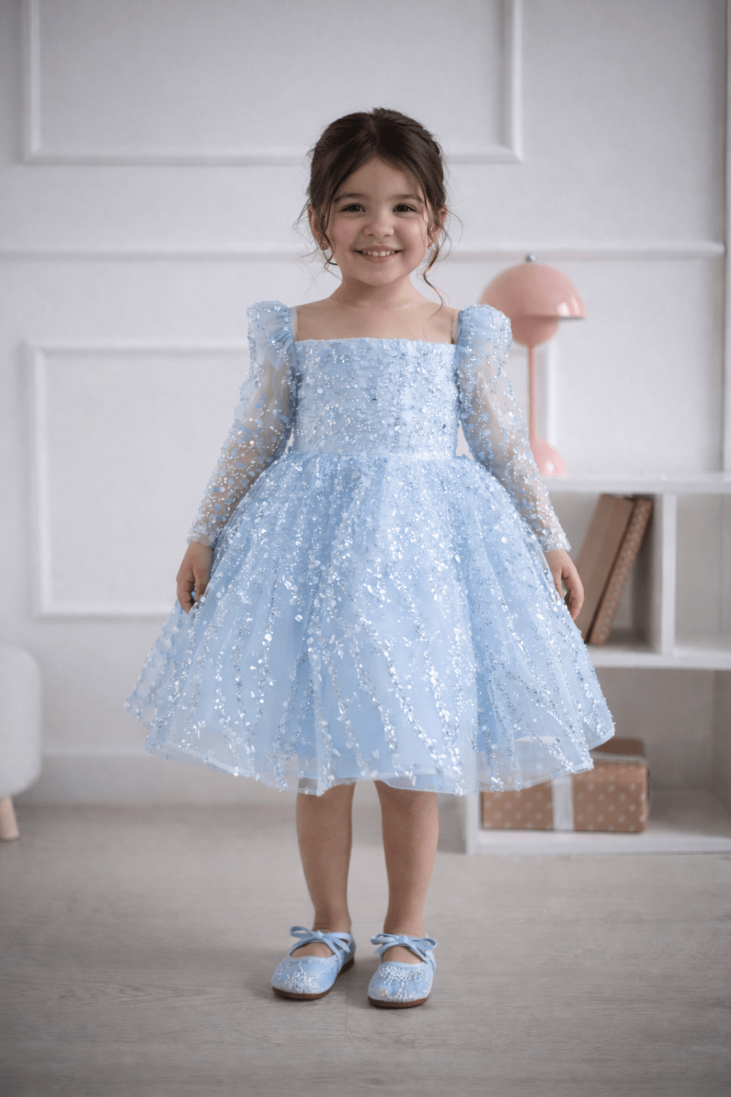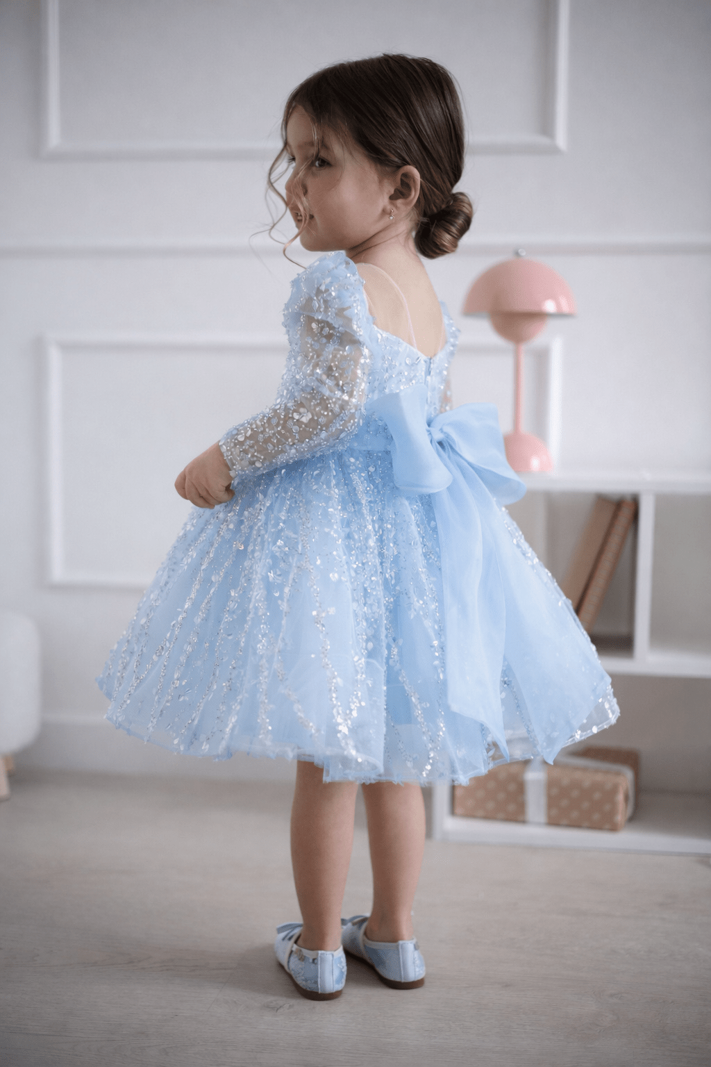 Designed in sparkly sequin tulle with soft mesh sleeves and a graceful square neckline, it captures the magic of every special moment. Finished with our signature oversized bow at the back, this enchanting gown is perfect for flower girls, birthdays, photoshoots, engagements, baptisms and celebrations filled with sparkle.