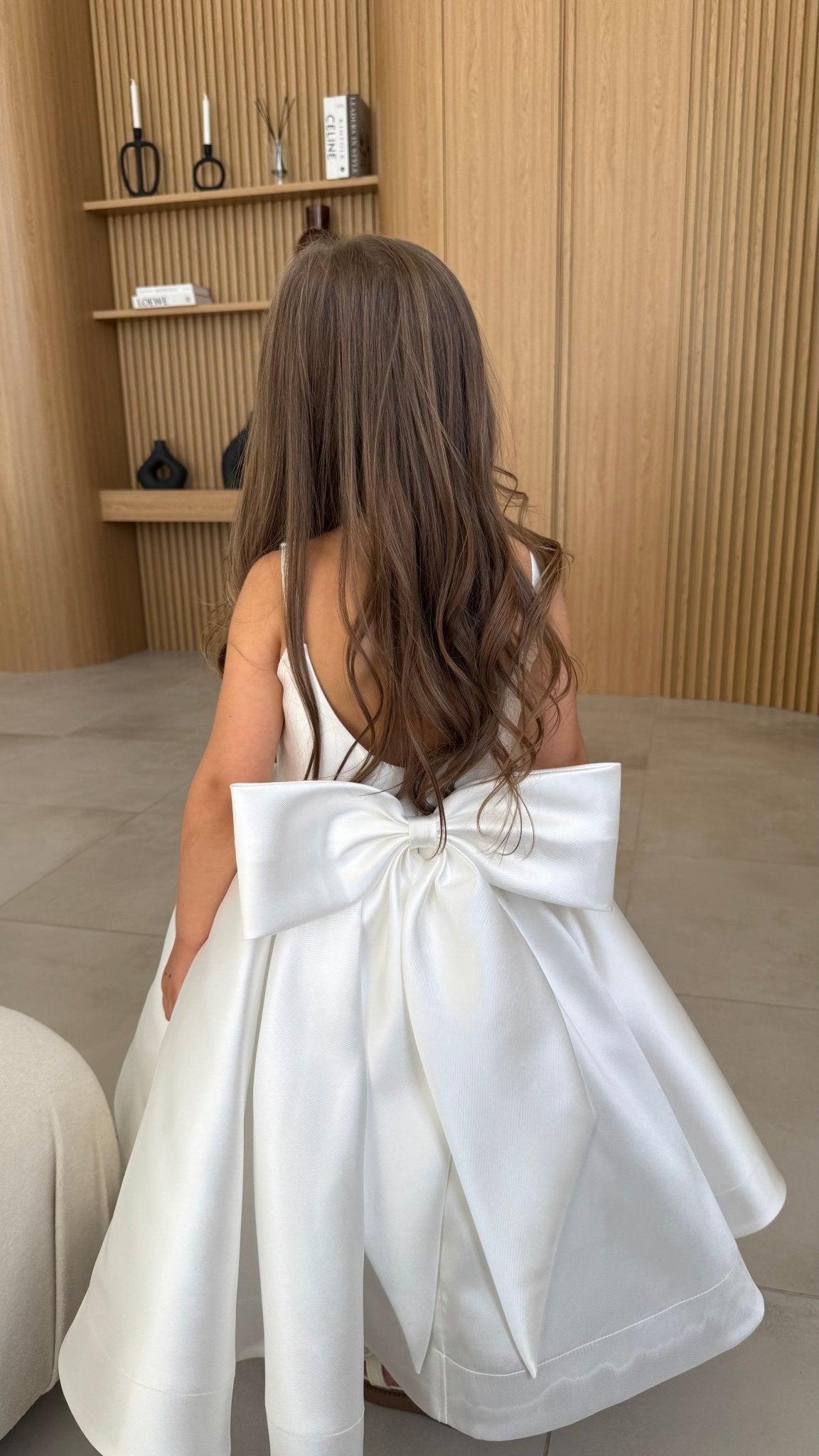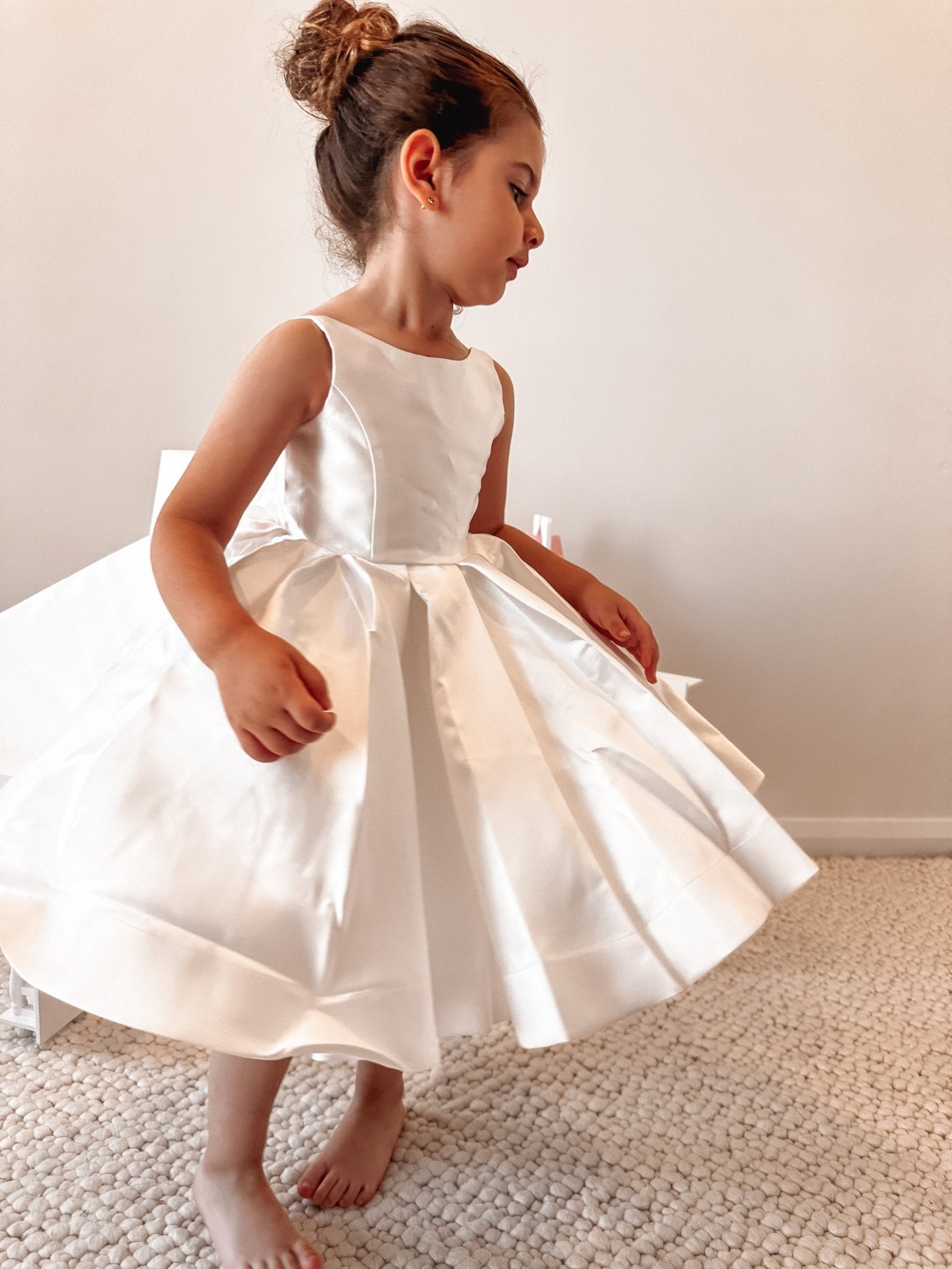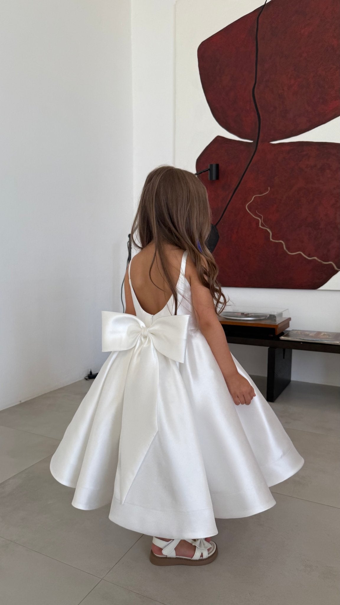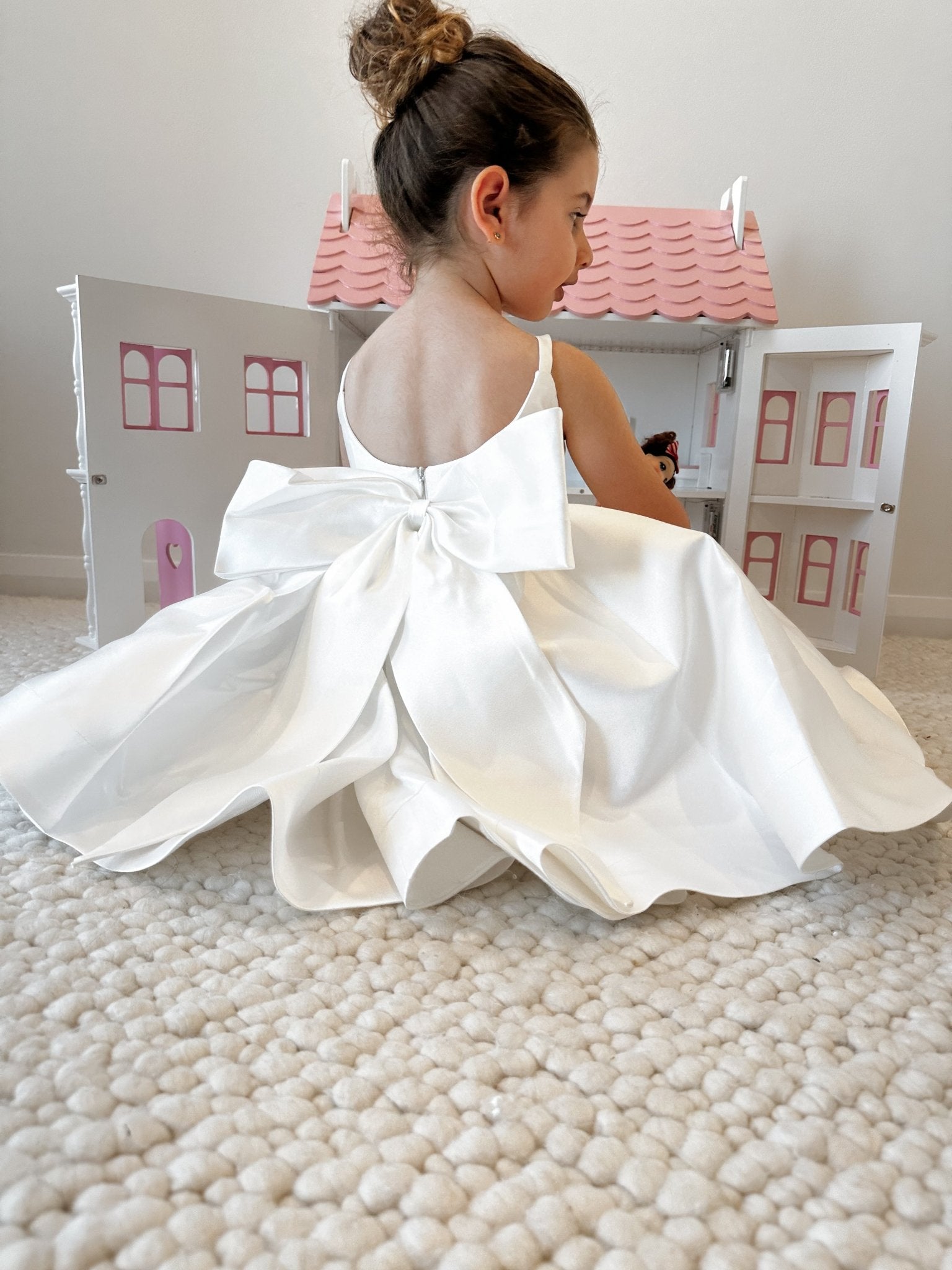 The dress features a stunning detachable oversized bow, a gently structured full skirt and a soft cotton inner lining to keep your little princess comfortable all day long. With its elegant low back and smooth satin finish, the Majestic Mikado Dress brings confidence, grace and true luxury to every milestone moment.