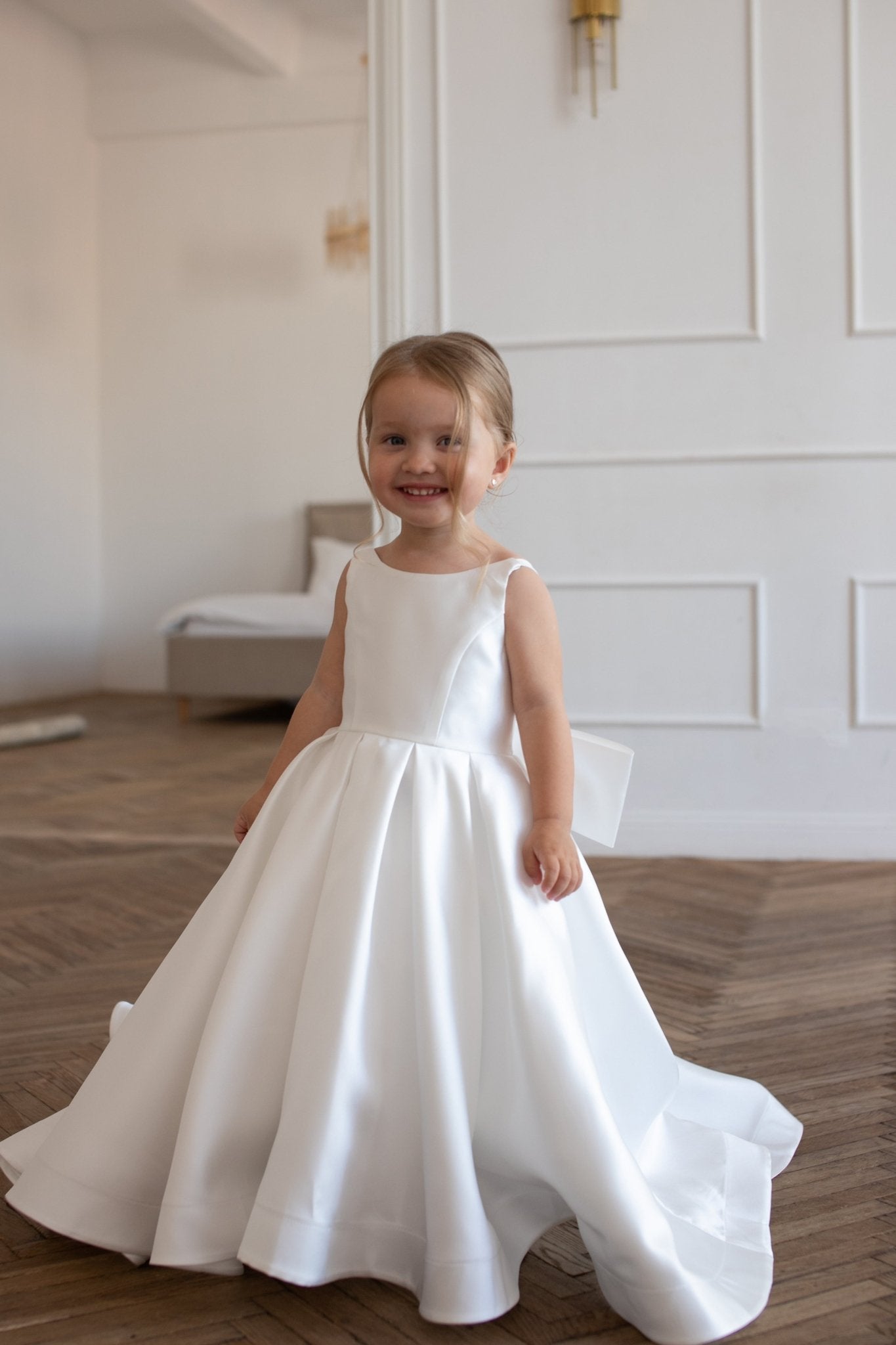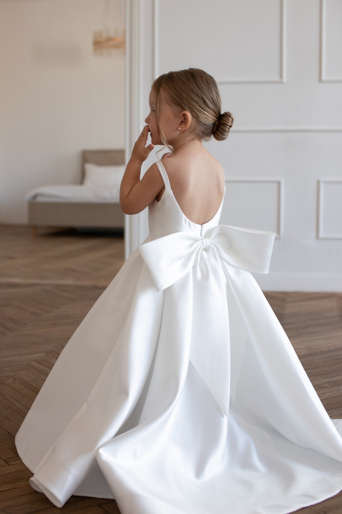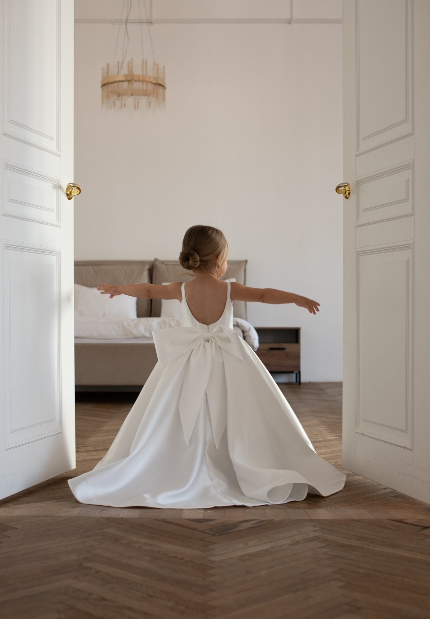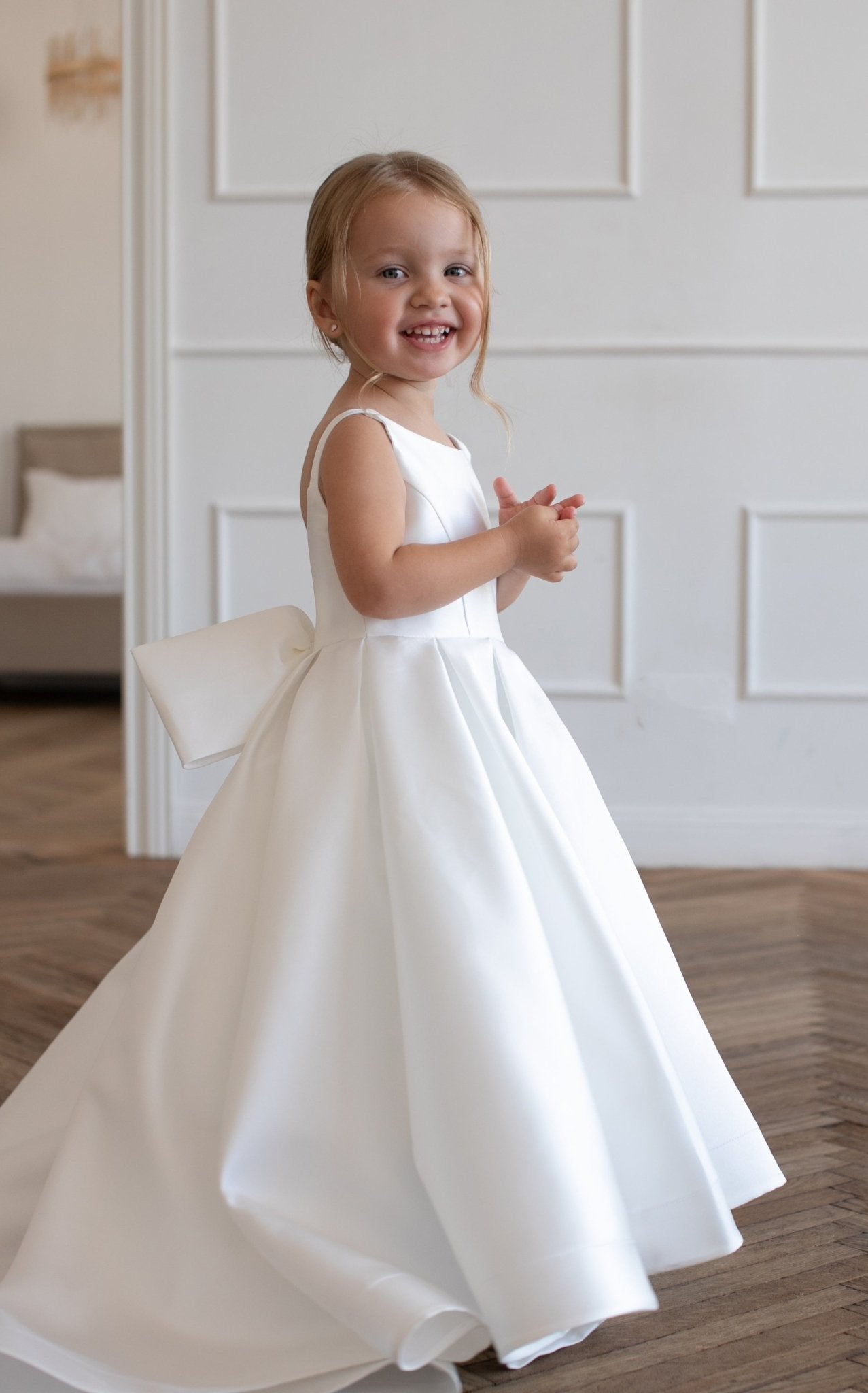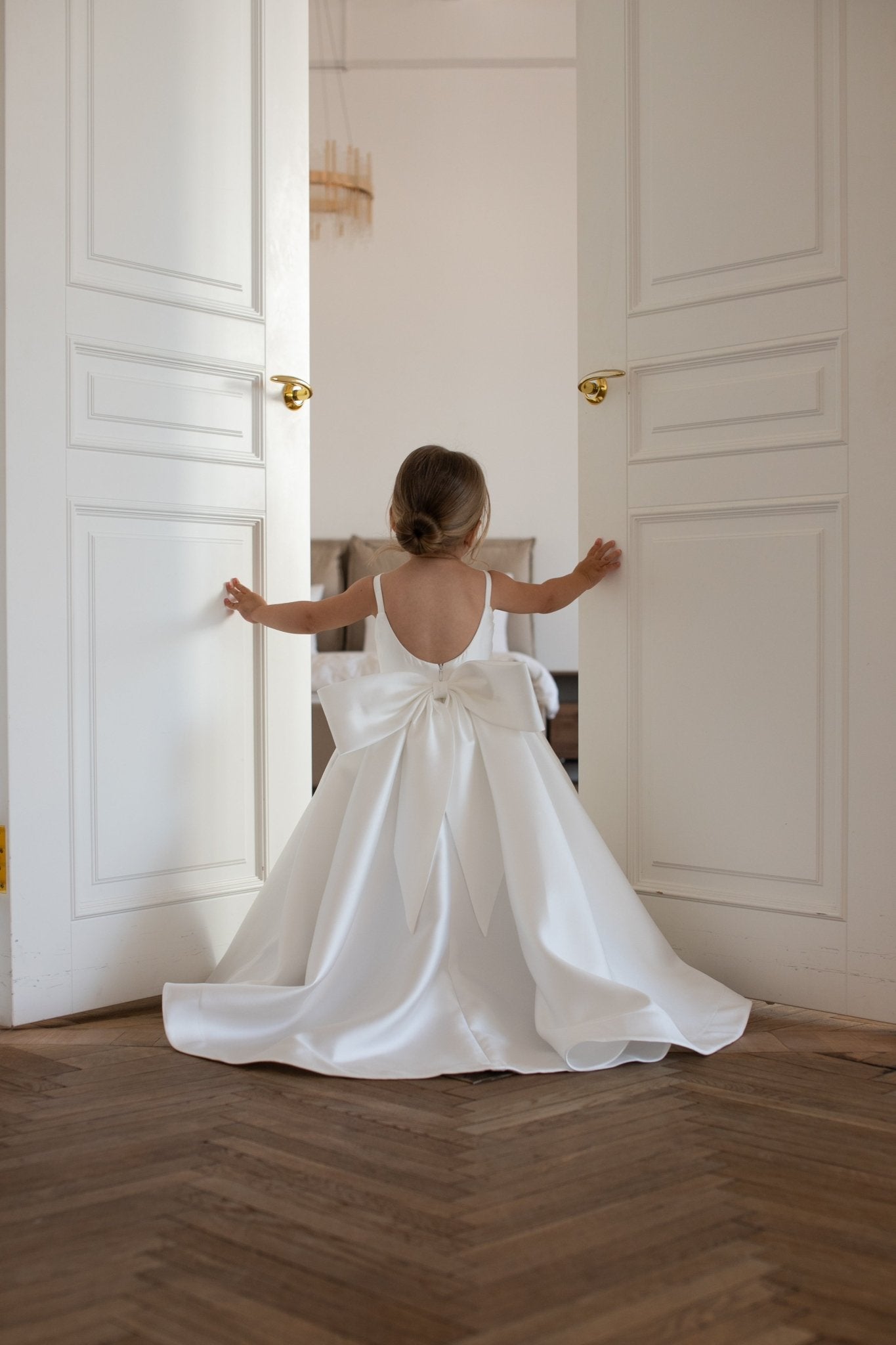 Handcrafted from premium, high quality luxury Mikado satin, this gown features a structured silhouette, a twirl worthy full skirt and a beautifully shaped bodice for the perfect princess look. A detachable oversized bow at the back adds a charming finishing touch, ideal for photographs and special moments.