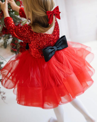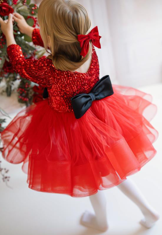 The Midnight Noël Dress is designed with a hand sequinned bodice, full layered tulle skirt and a signature velvet bow that adds a touch of midnight elegance. Every stitch is crafted in Europe, creating a keepsake piece made for sparkling holiday photos, Christmas events and magical family moments.