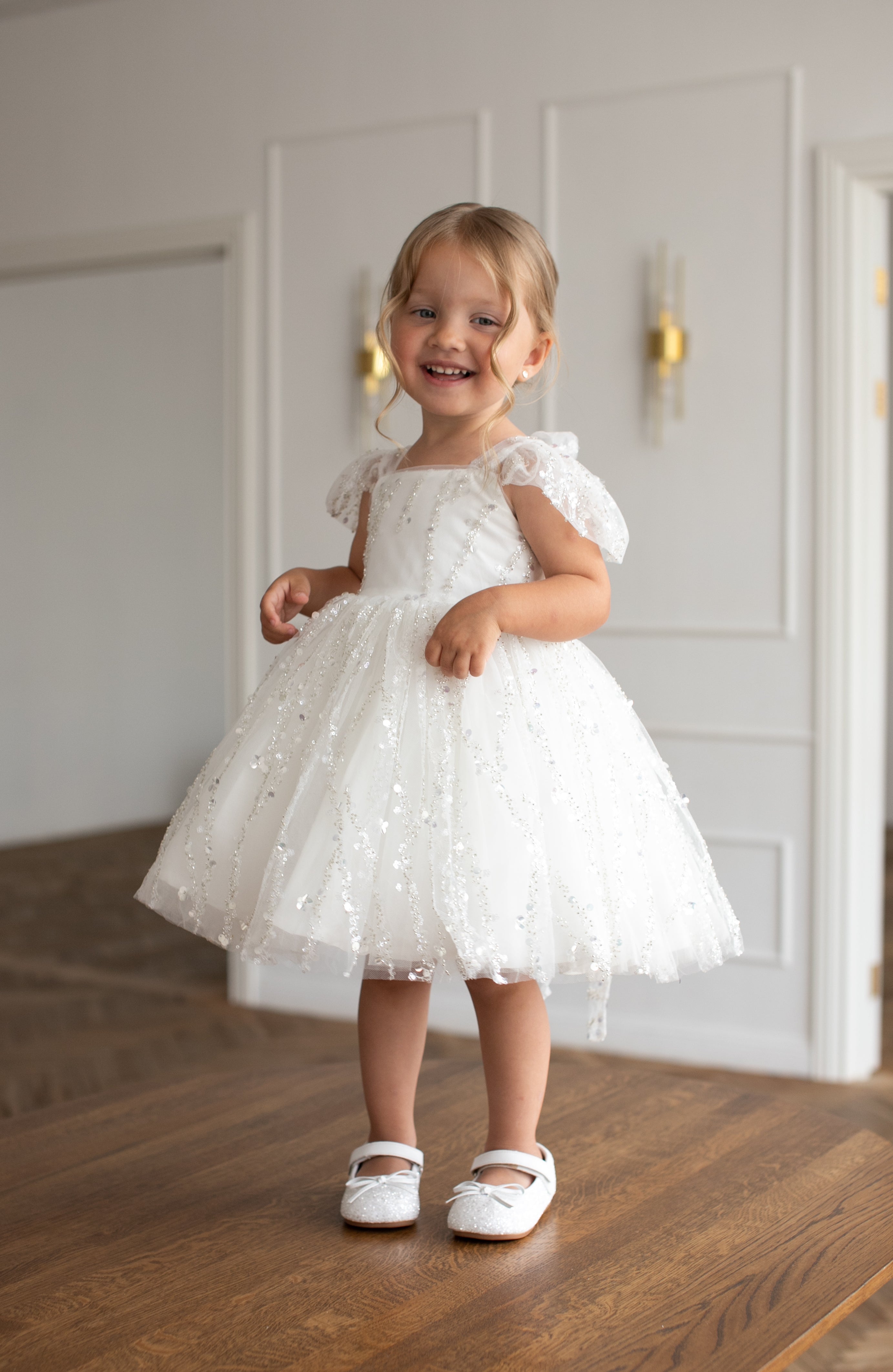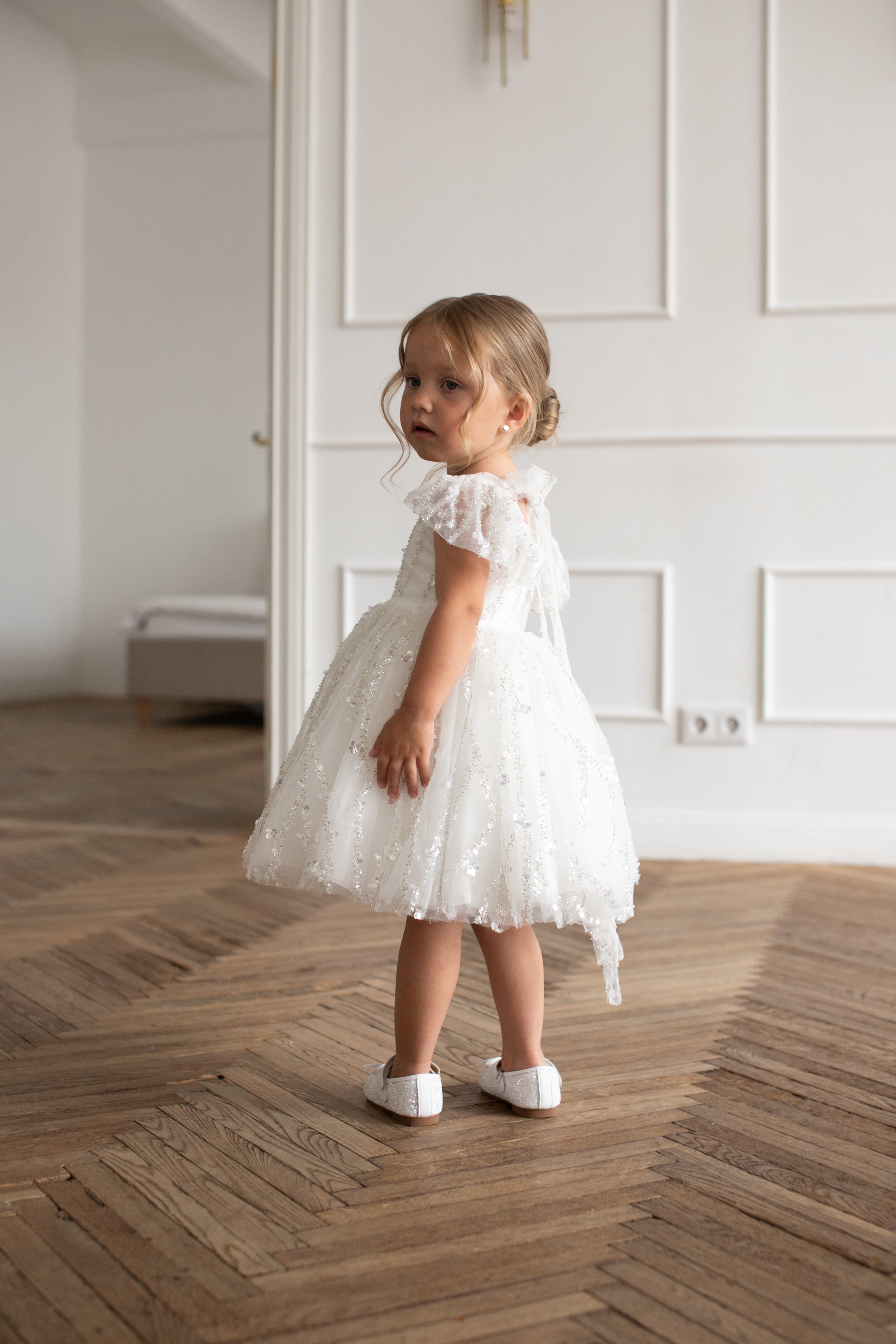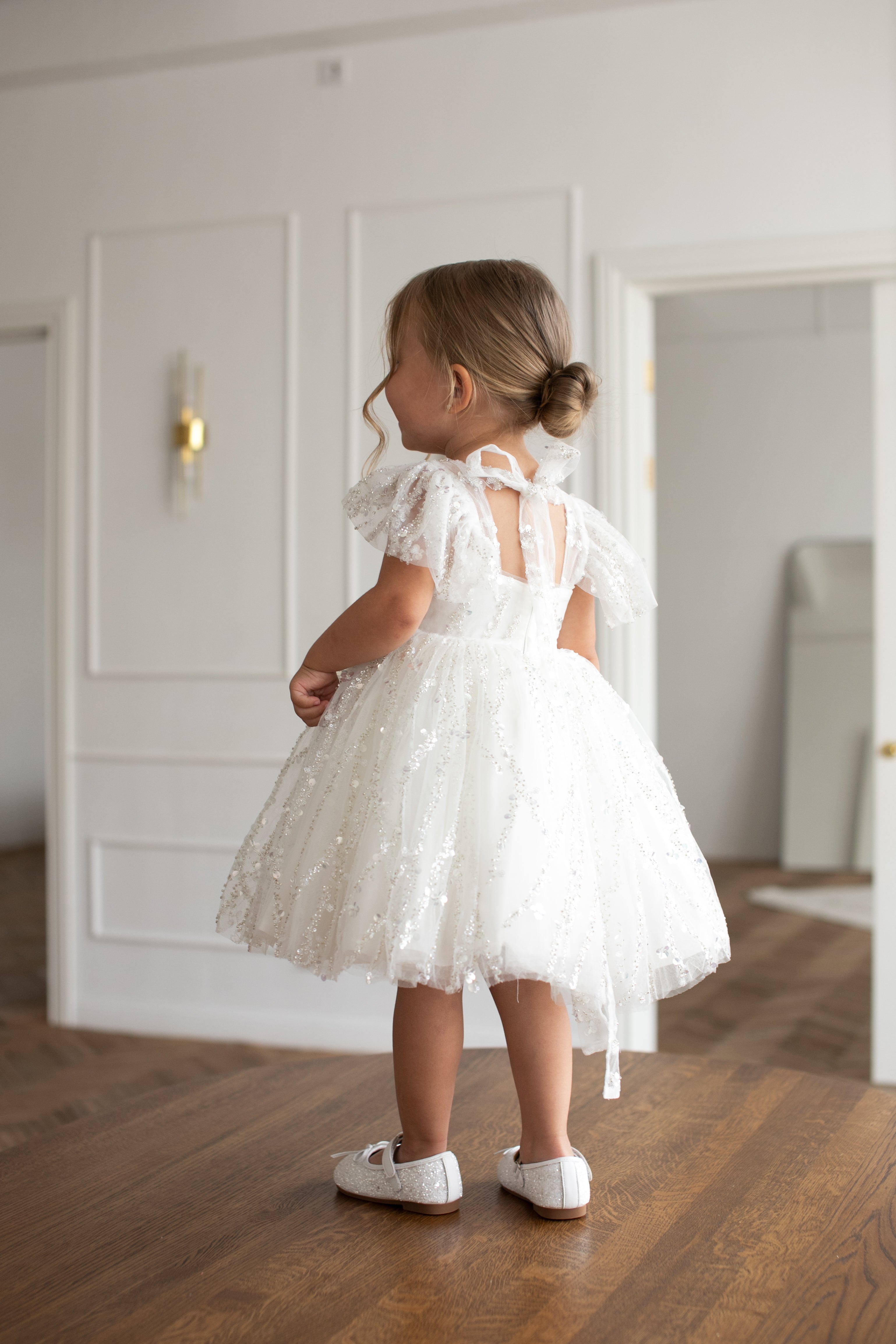 The Dahlia Blossom Dress is a luxury white flower girl dress designed for weddings, birthdays, photoshoots and special occasions. This handcrafted sequin dress features a soft layered tulle skirt, flutter sleeves, and a beautiful tie-back bow, creating a dreamy silhouette little girls love to twirl in.