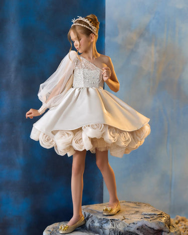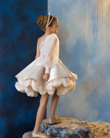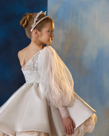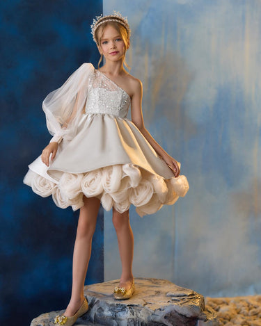 Hand made with a sparkling sequin bodice, a dreamy one shoulder tulle sleeve and a voluminous bubble skirt finished with hand rolled rosette detailing. This luxury gown captures pure fairytale magic with every step.