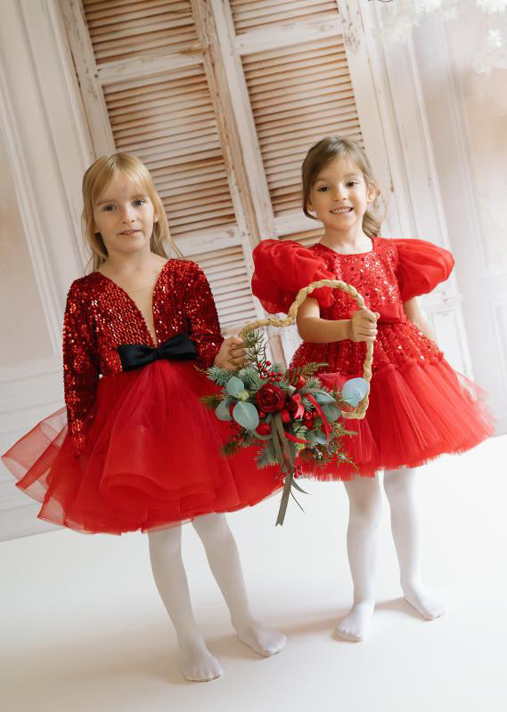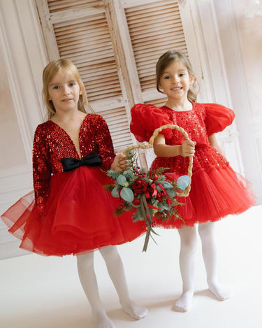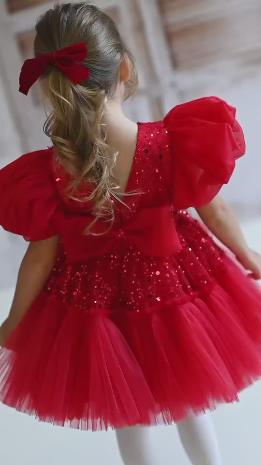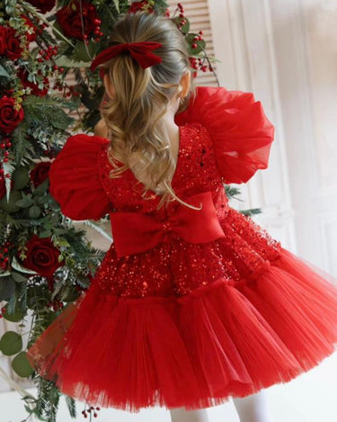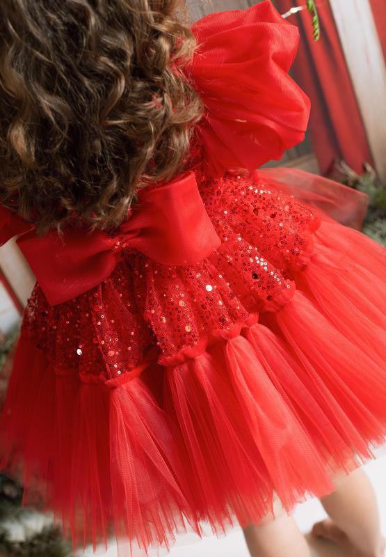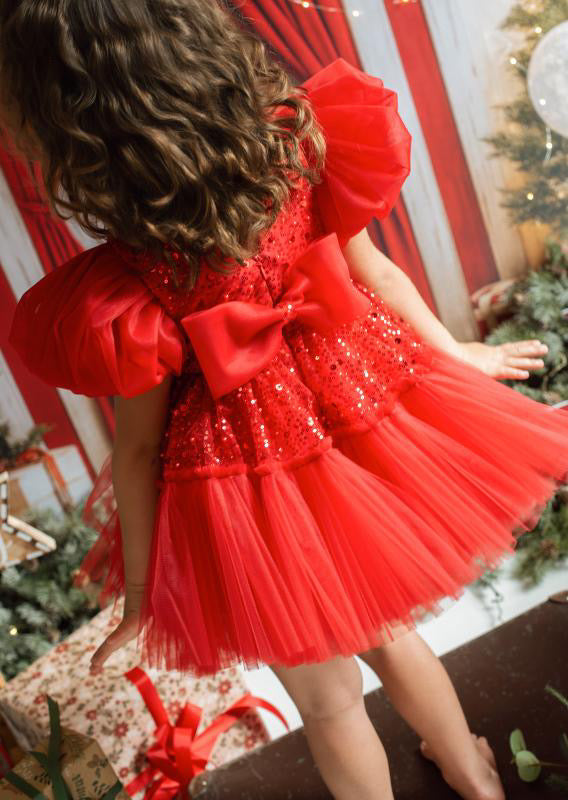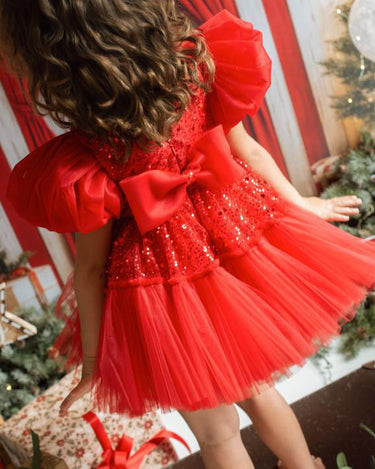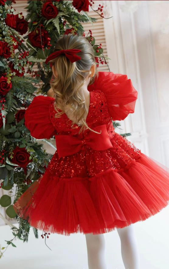 Designed in rich festive red and covered in hand placed sequins, this show stopping Christmas dress brings sparkle to every twirl. The voluminous tulle skirt, statement bow back and puff sleeves create a fairytale silhouette that feels as special as the season itself.